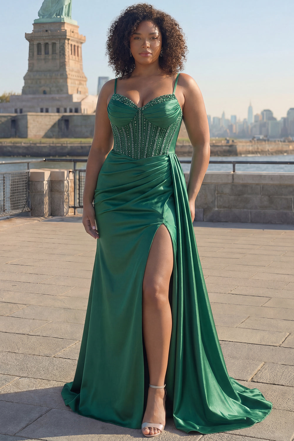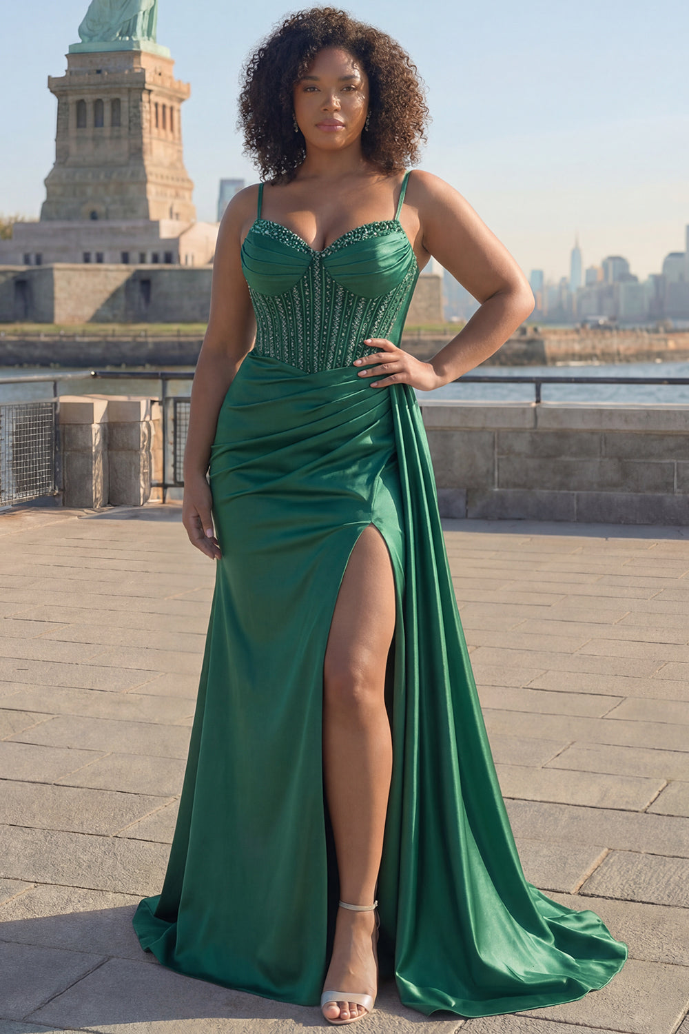 Dark Green Beaded Mermaid Corset Satin Plus Size Long Prom Dress with Slit