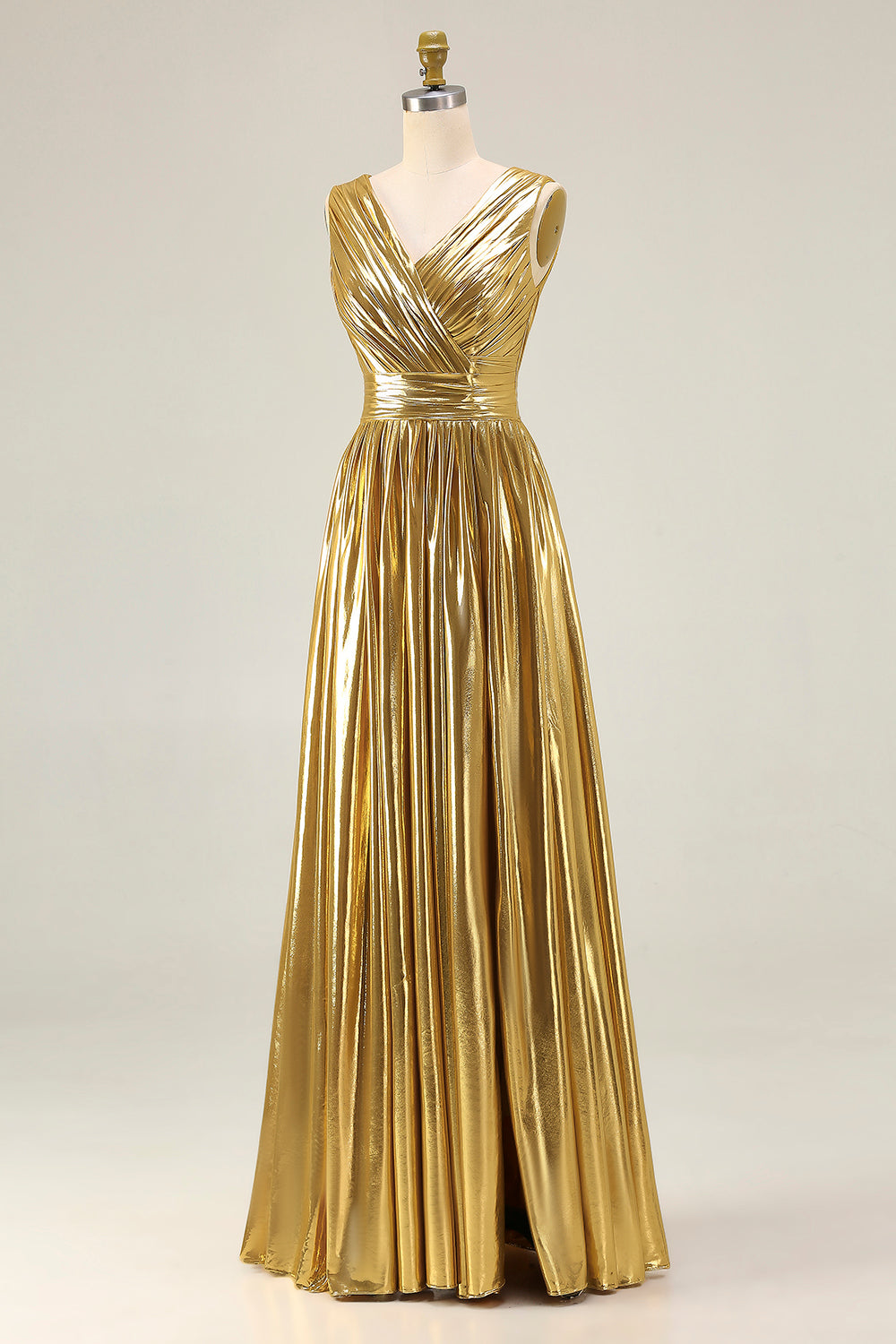 Metallic Gold V-Neck A-Line Long Formal Dress With Slit