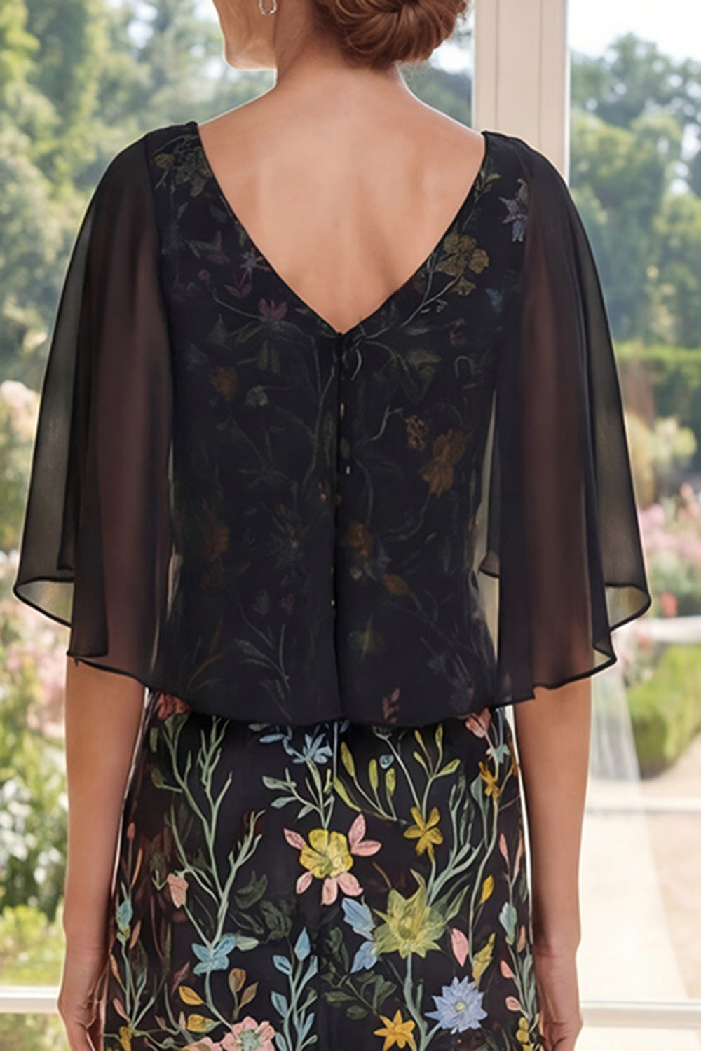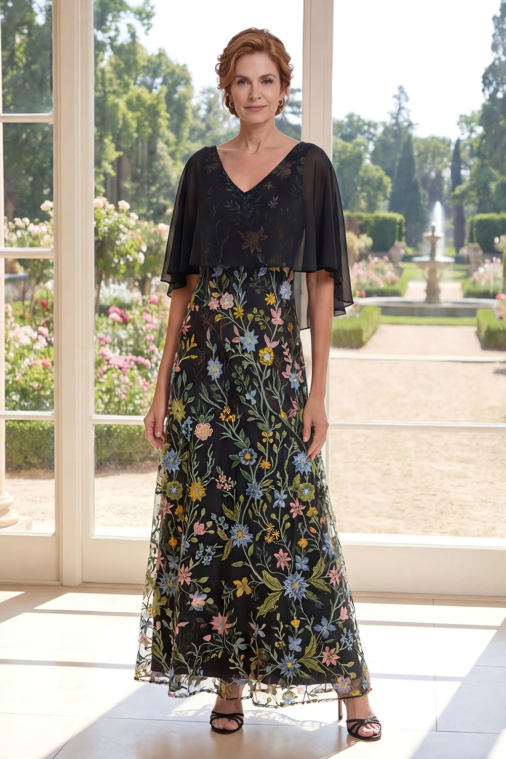 A-Line Tulle Black Embroidered Long Mother Of the Bride Dress with Flutter Sleeves
