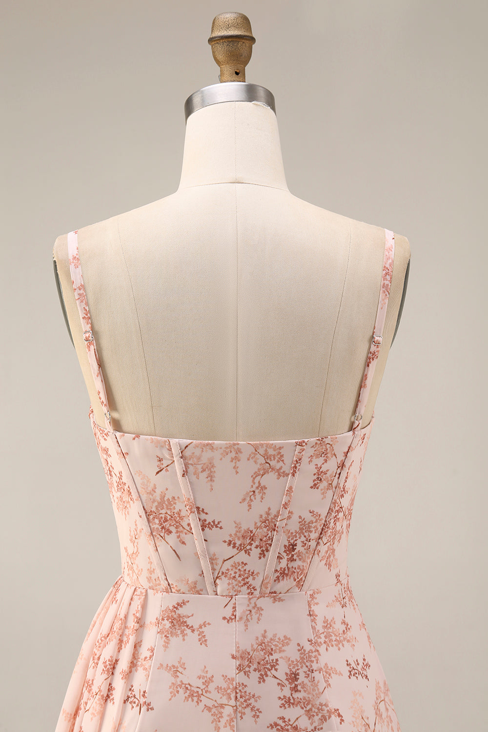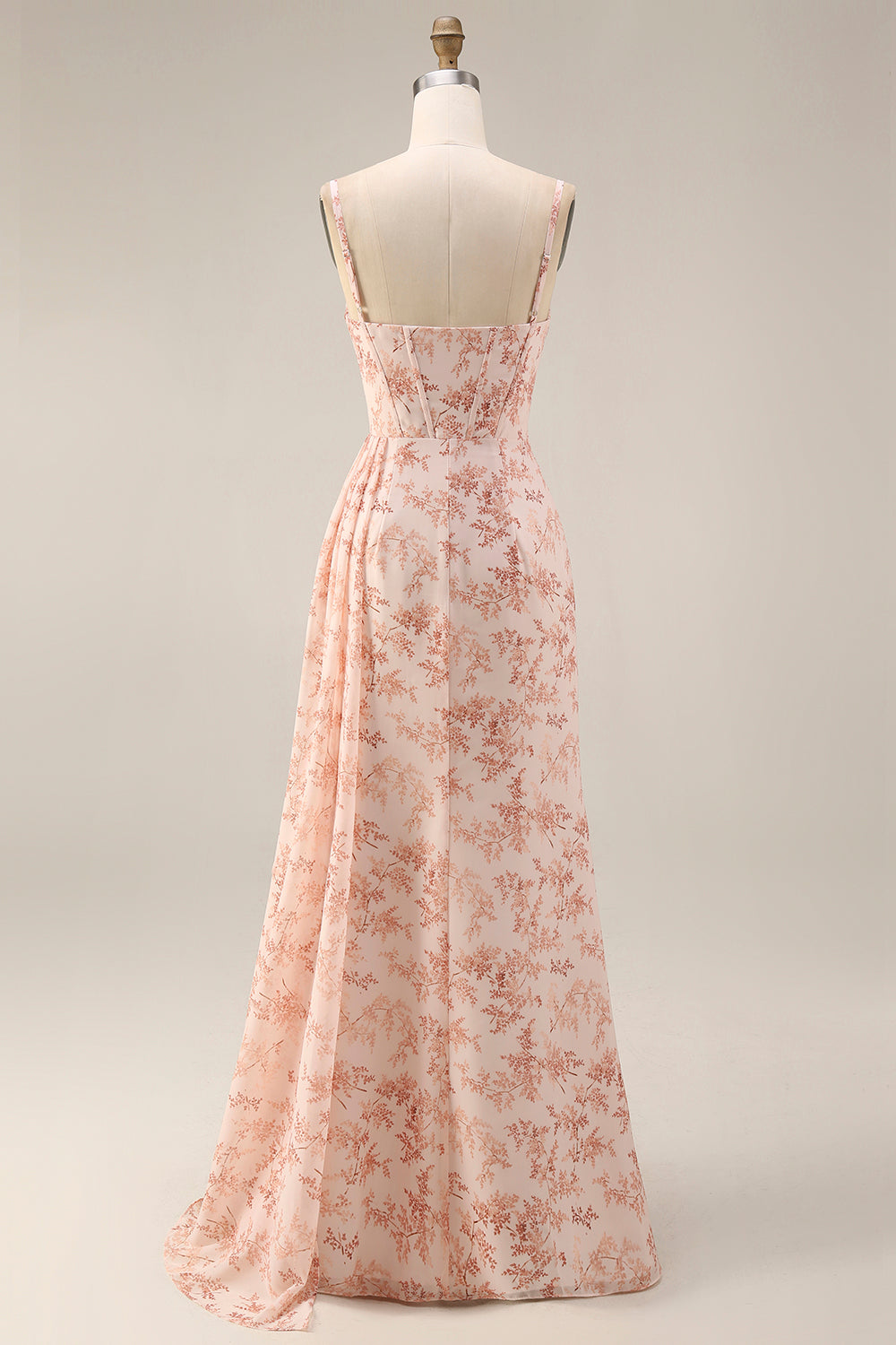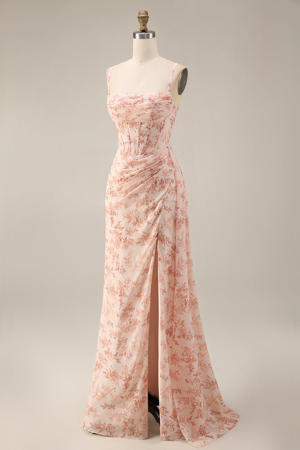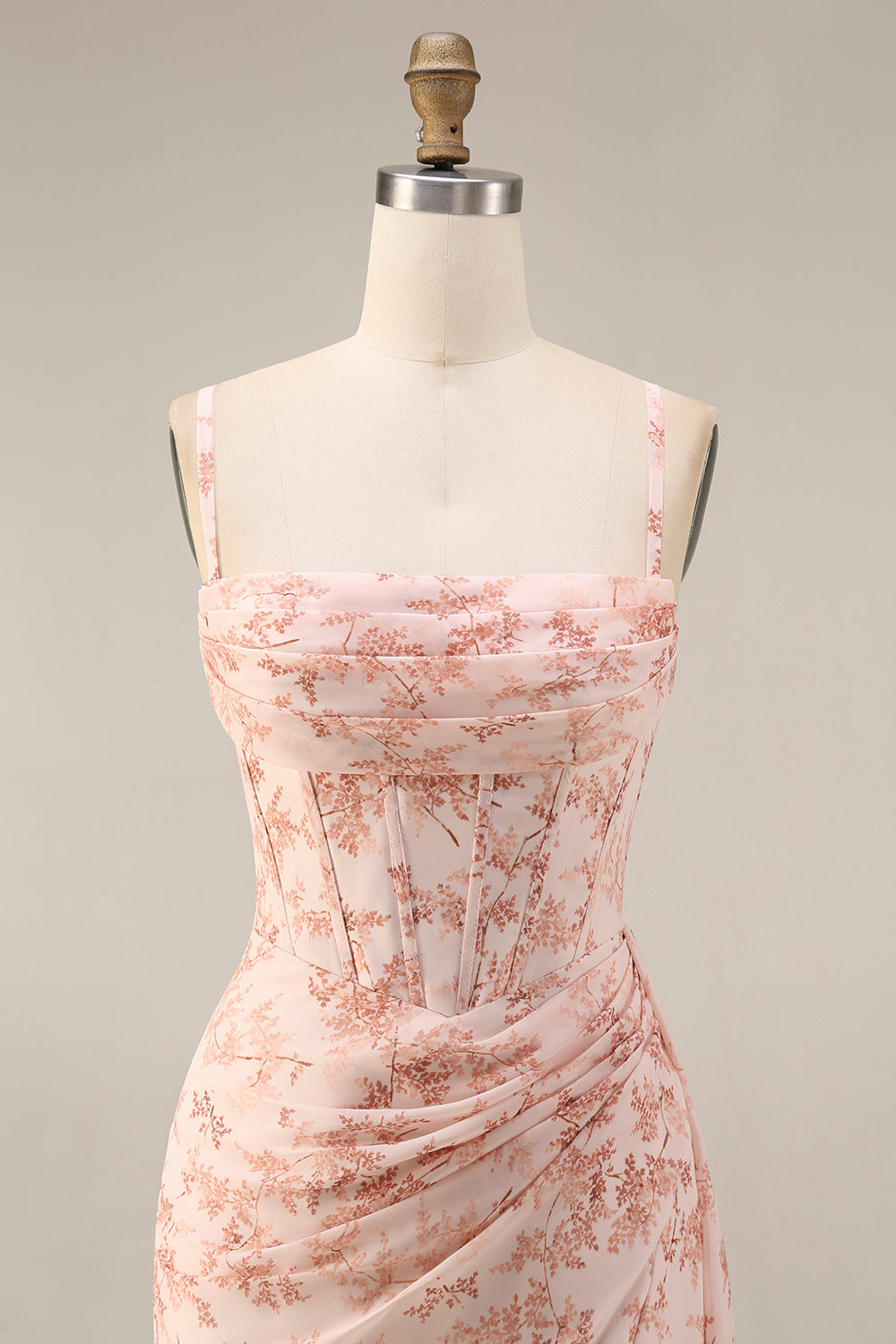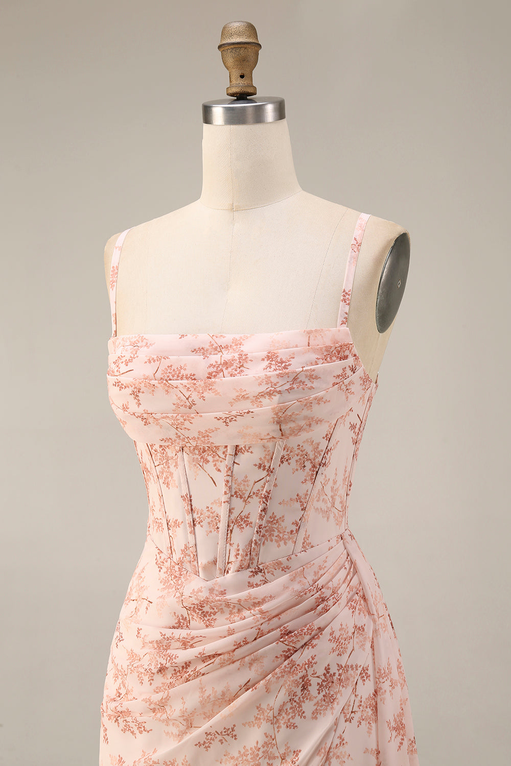 Dusty Sage Mermaid Corset Ruched Chiffon Long Floral Dress with Slit