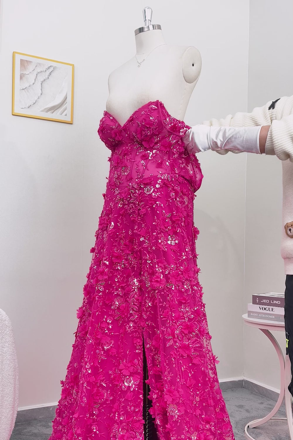 Fuchsia A Line Sequins Sheer Corset 3D Flowers Long Prom Dress with Slit