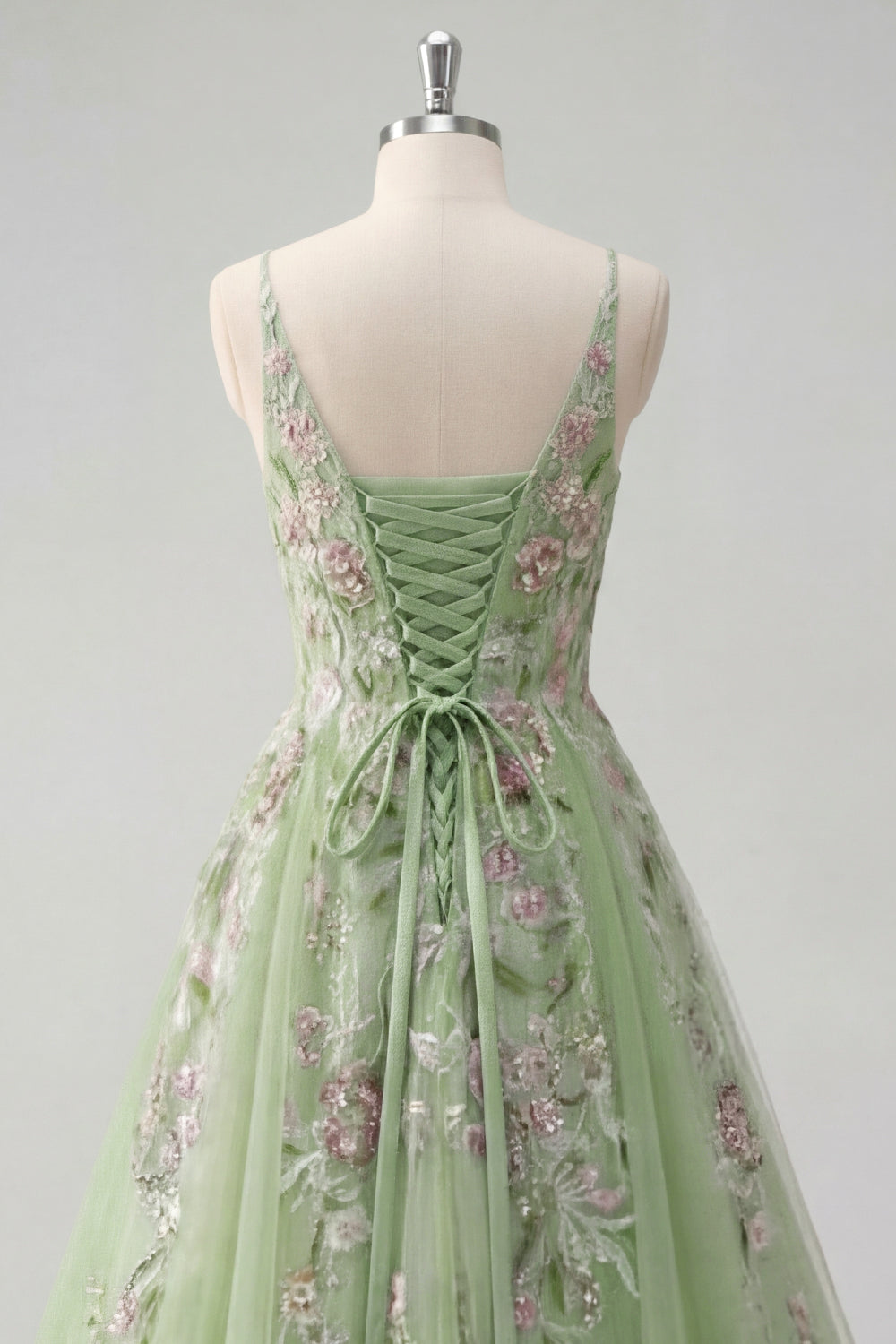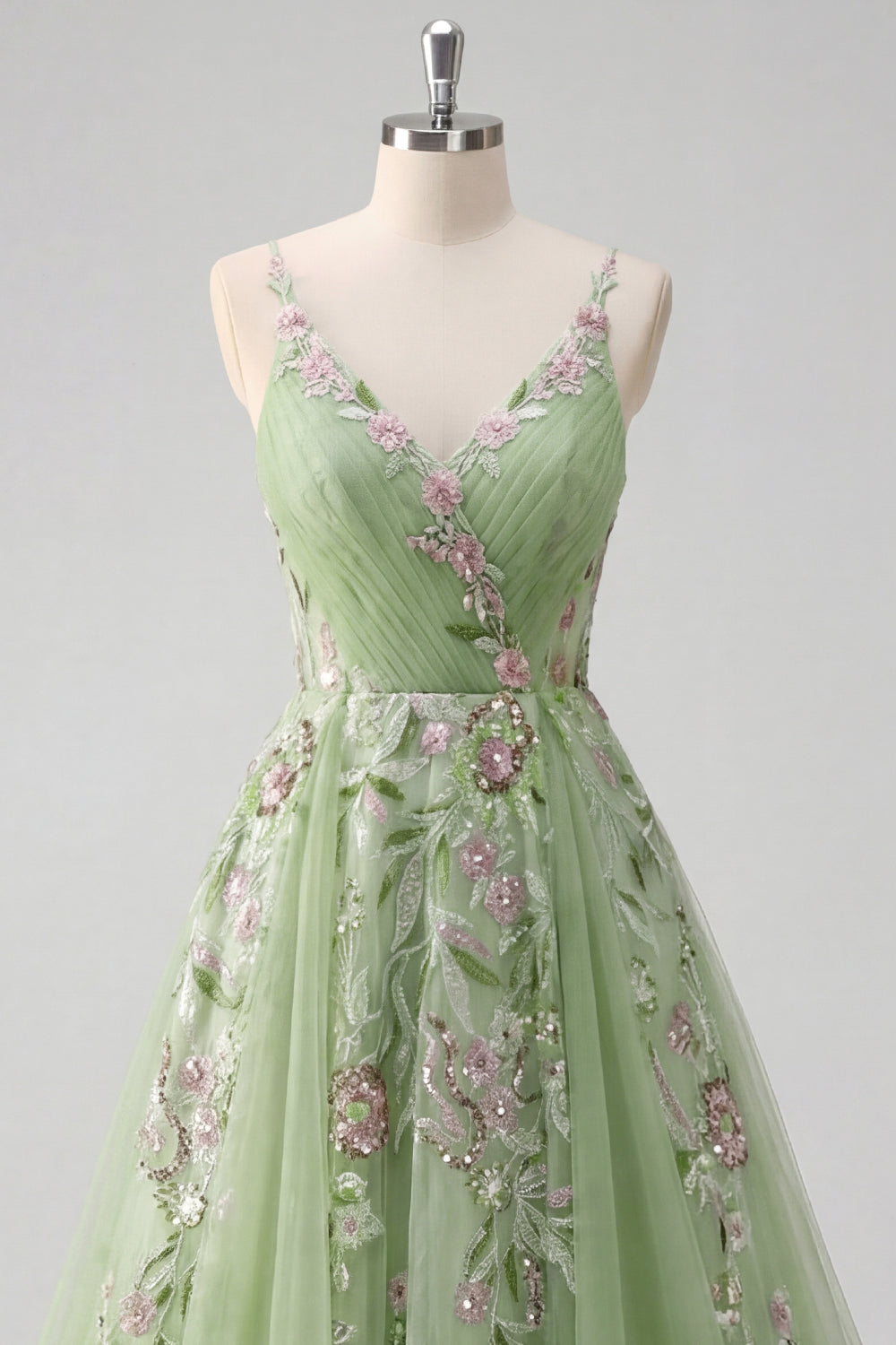 Green Spaghetti Straps Floral A Line Tulle Prom Dress