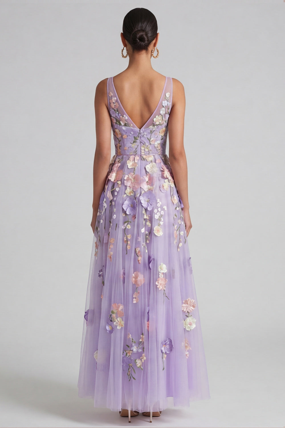 Lilac Appliqued V Neck A Line Midi Floral Dress