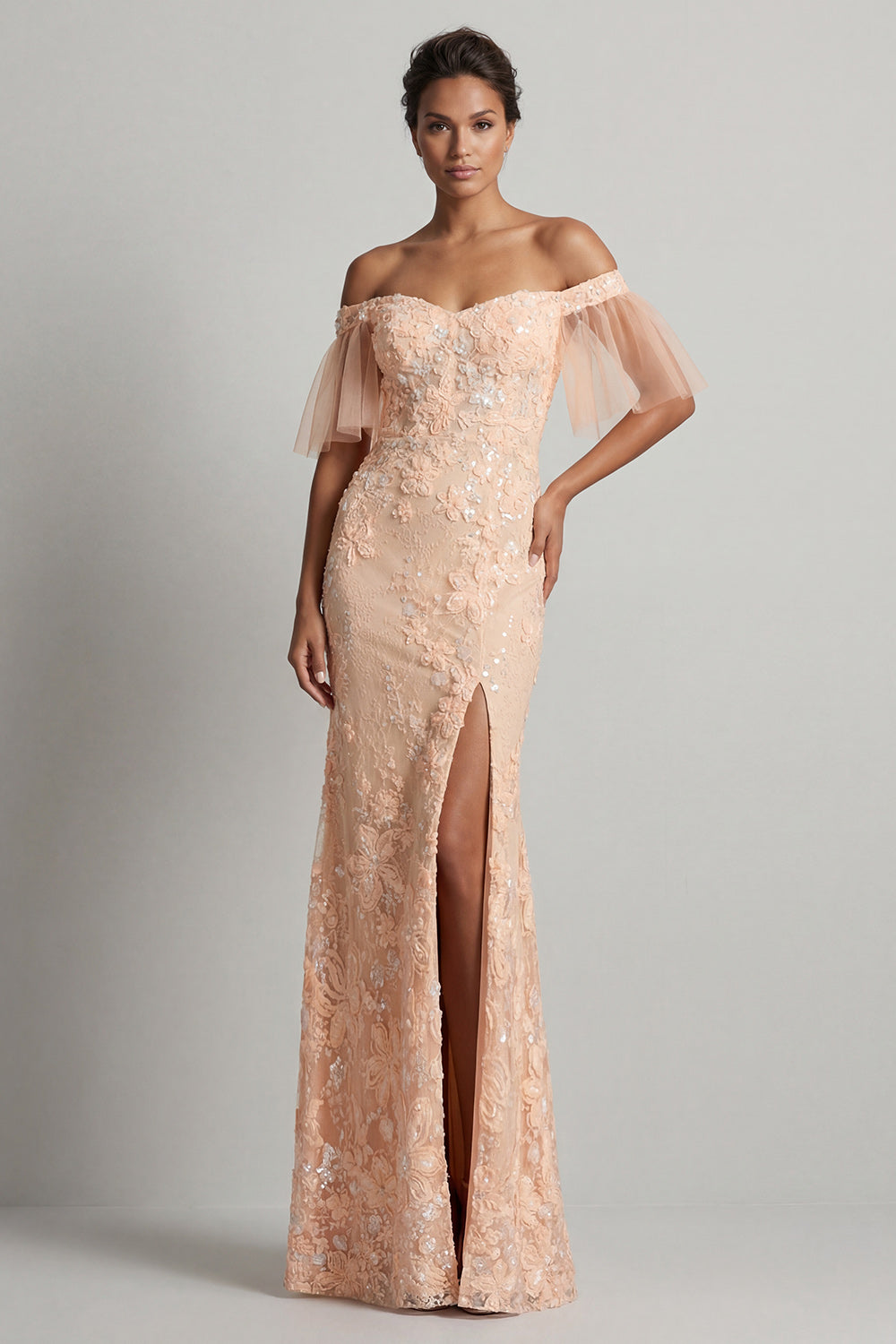 Long Beaded Sparkly Peach Floral Mermaid Mother of the Bride Dress with Slit