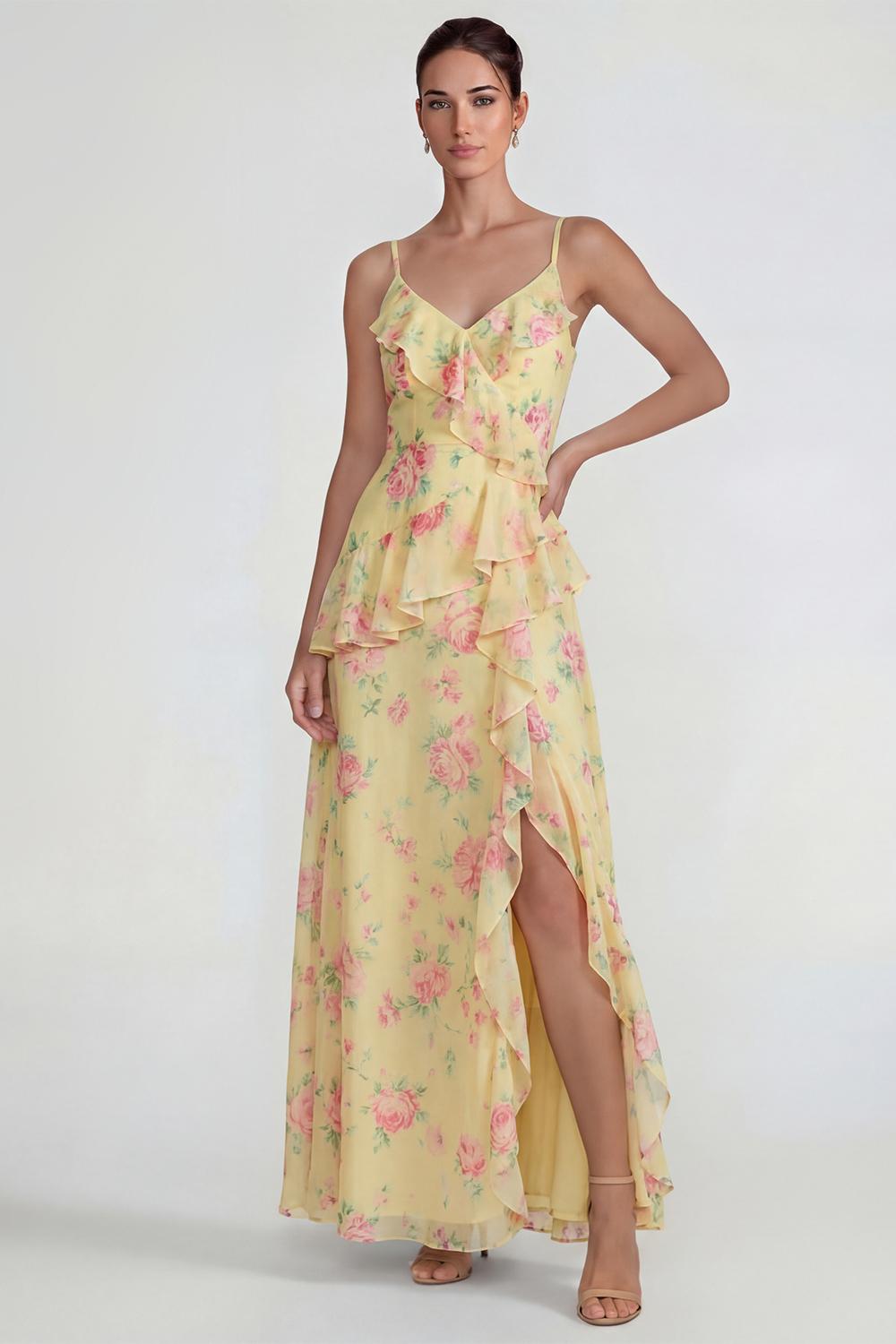 Ruffled Pink A Line Chiffon Floral Maxi Dress with Slit