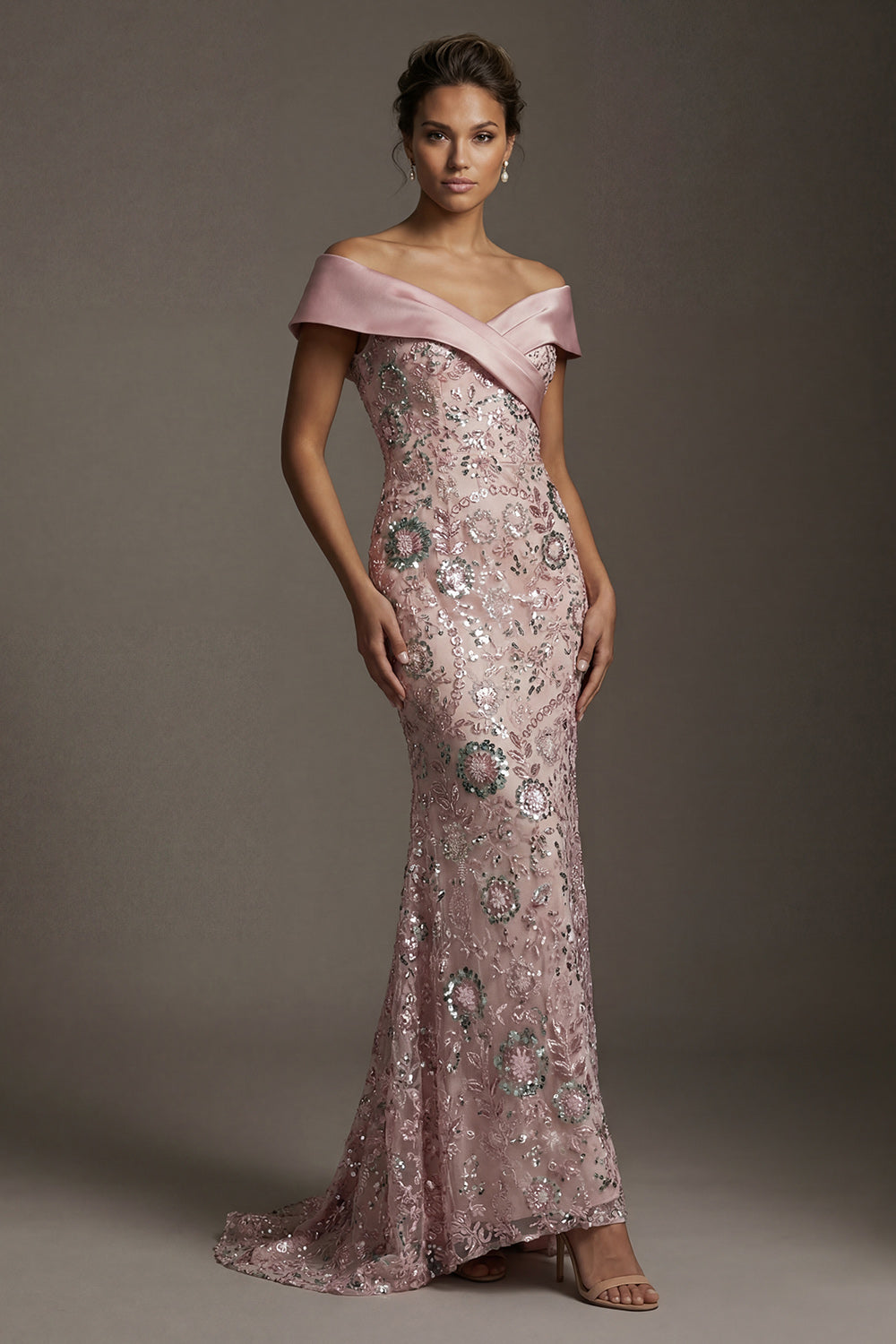 Sparkly Pink Long Off the Shoulder Mermaid Beaded Mother of the Bride Dress