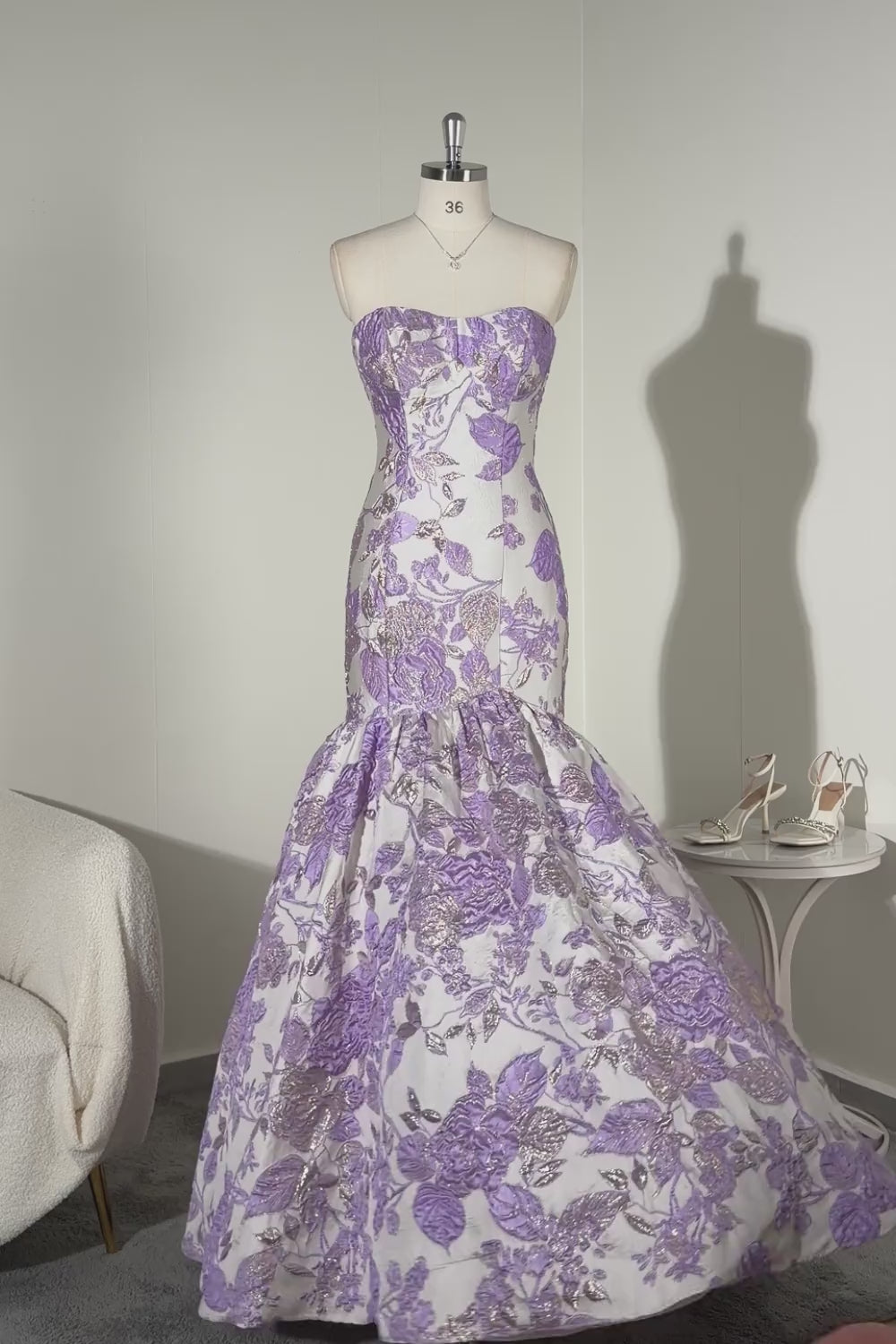 Strapless Mermaid Lilac Jacquard Satin Brocade Long Floral Prom Dress