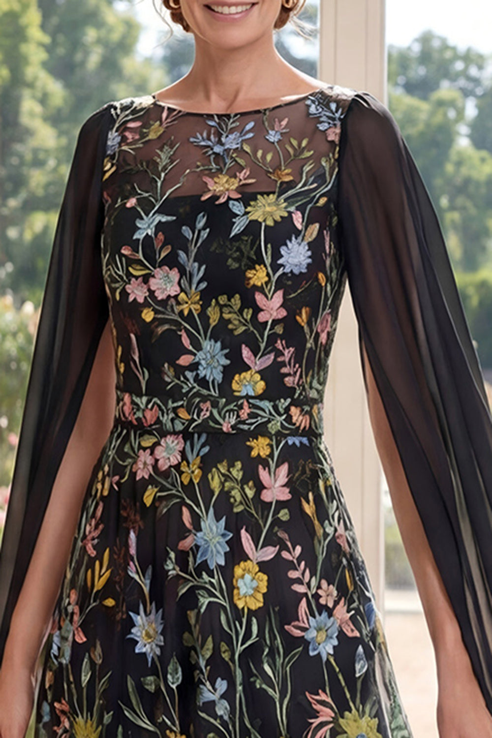 Tulle Black A-Line Embroidered Long Mother Of the Bride Dress with Cape Sleeves