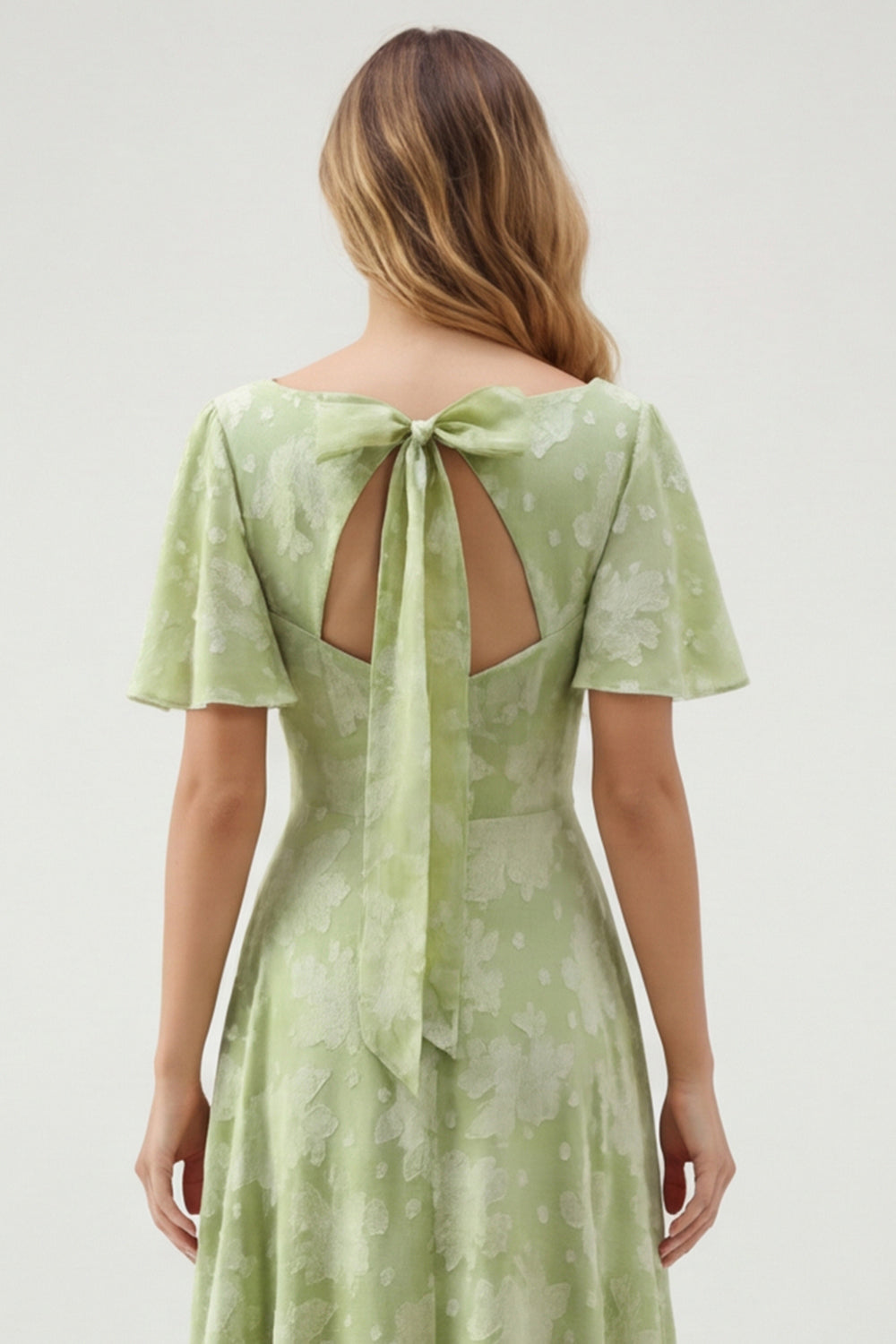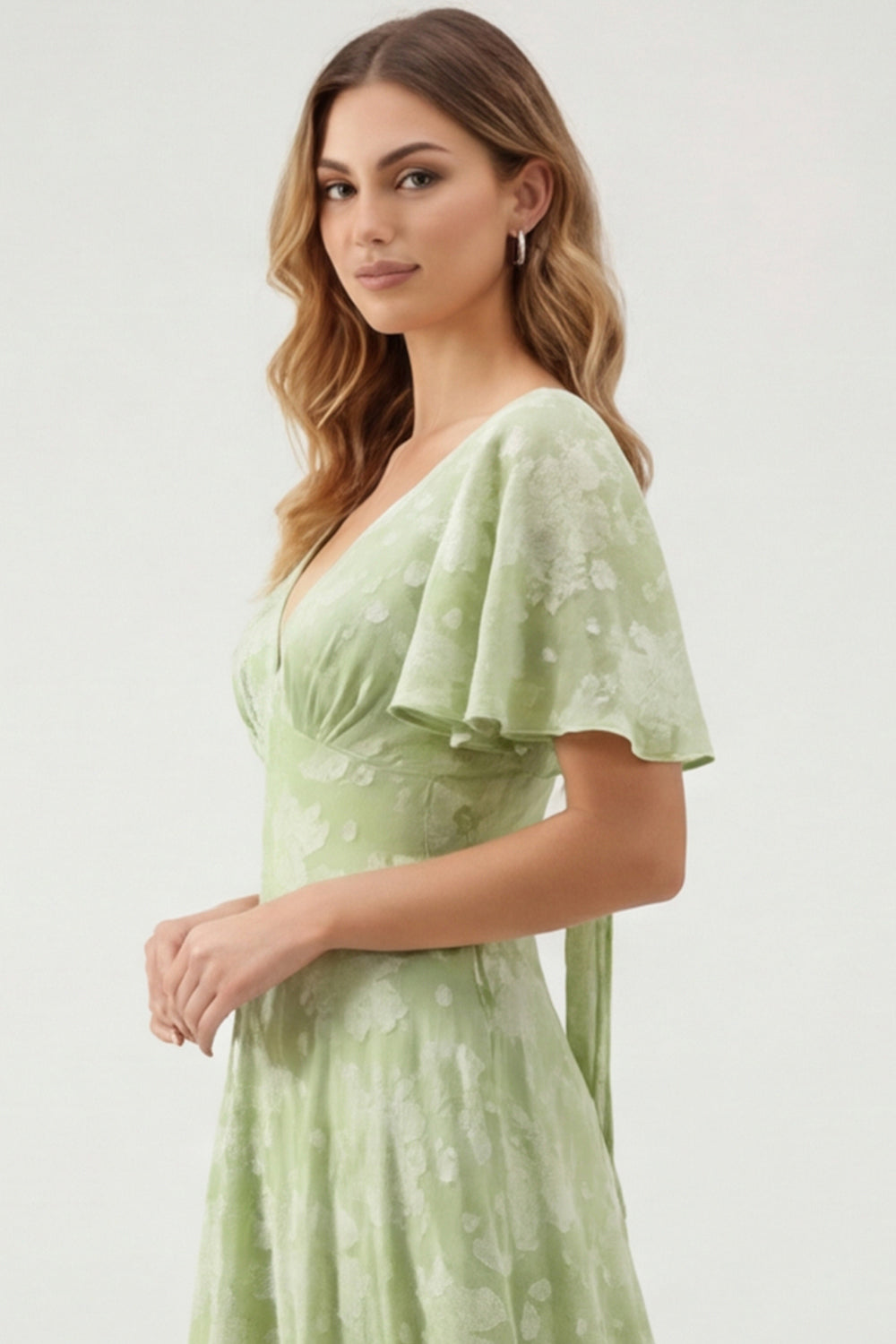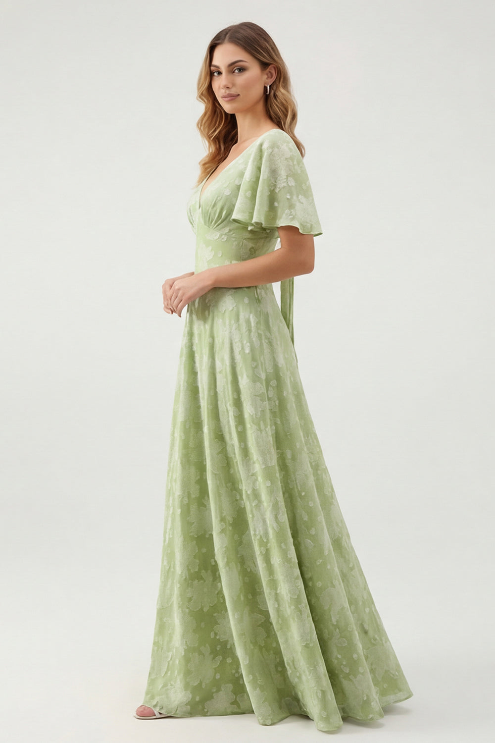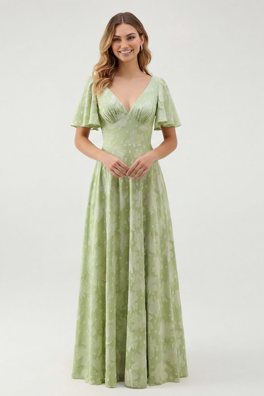 Green Floral A Line V-Neck Long Bridesmaid Dress with Short Sleeves