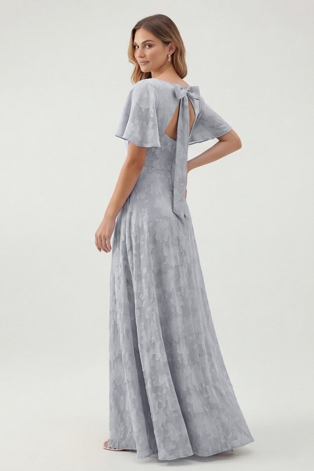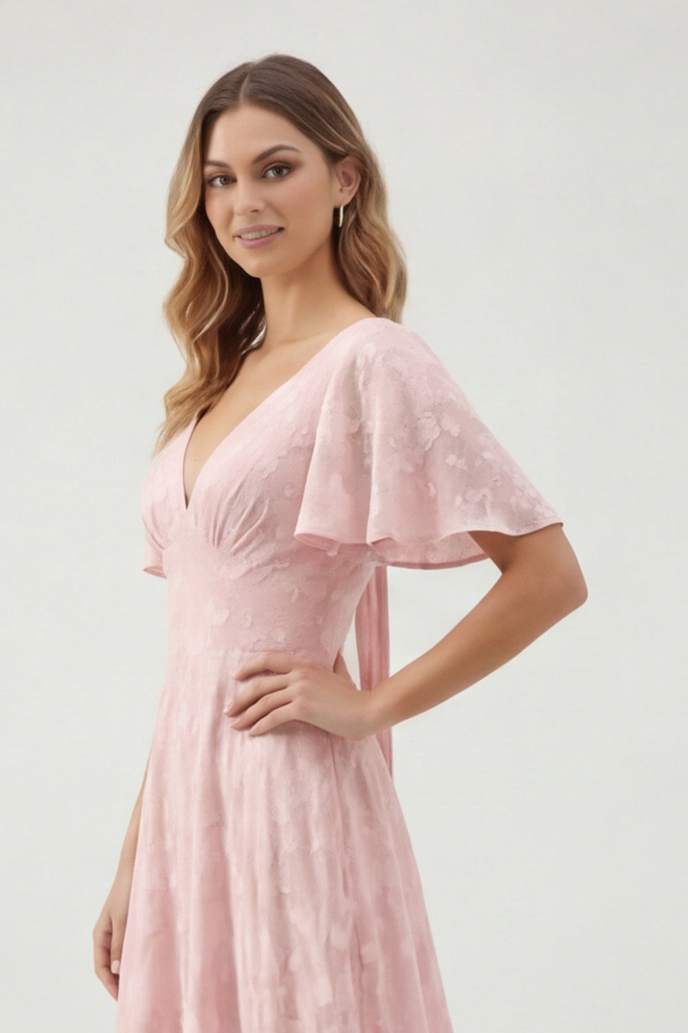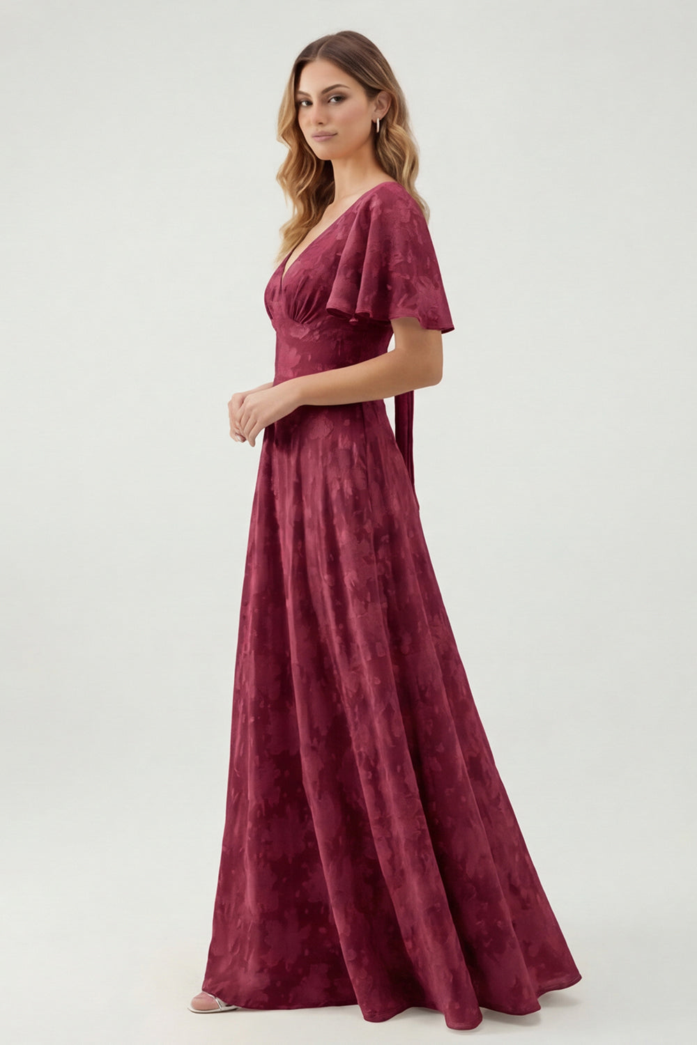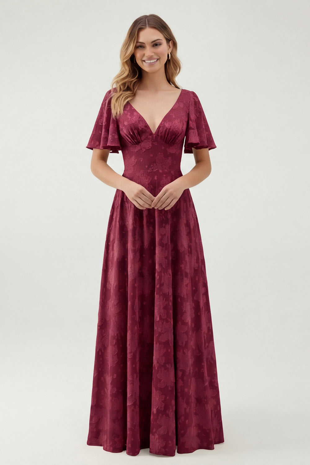 Green Floral A Line V-Neck Long Bridesmaid Dress with Short Sleeves