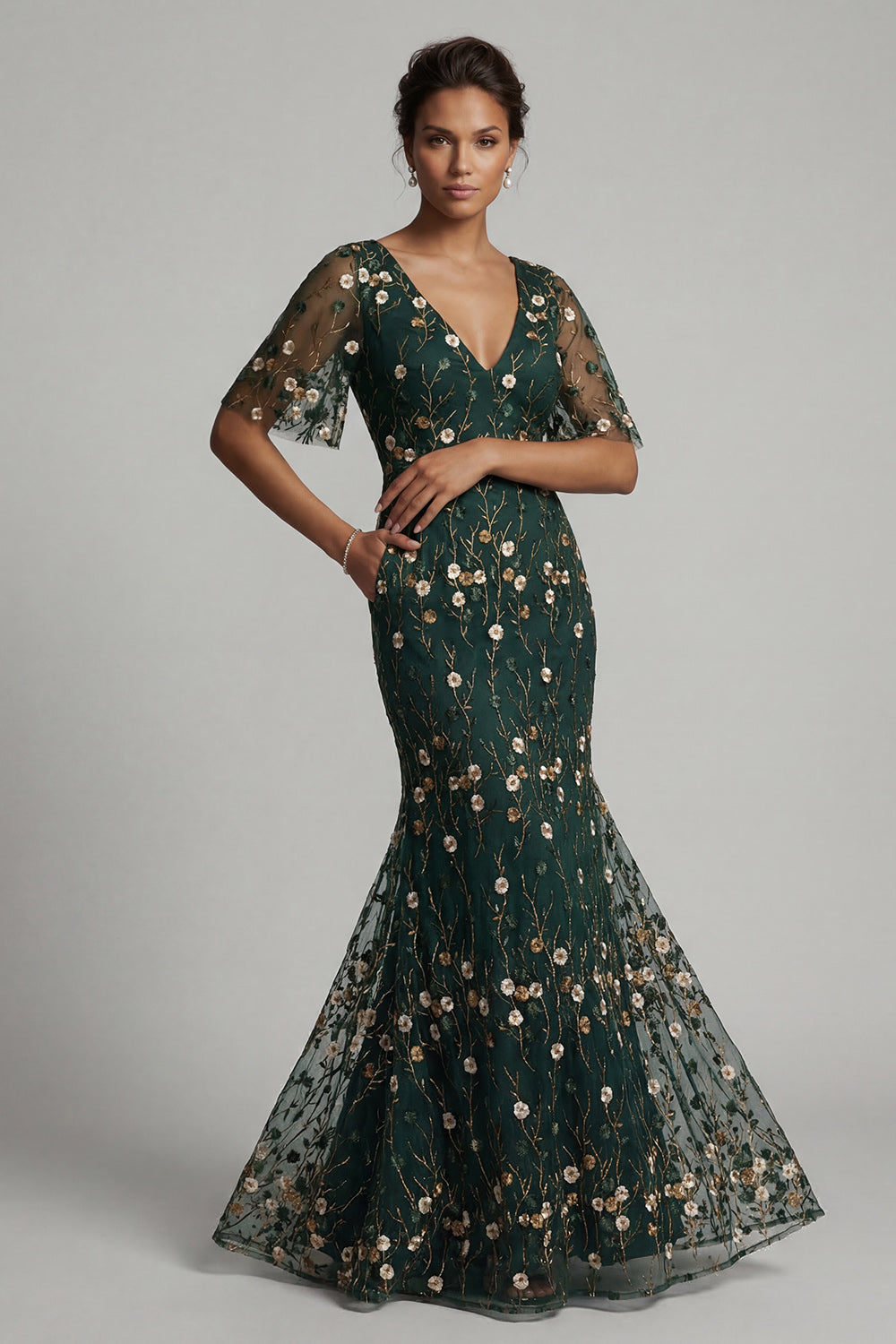 Dark Green Mermaid Embroidered Long Mother of the Bride Dress with Short Sleeves