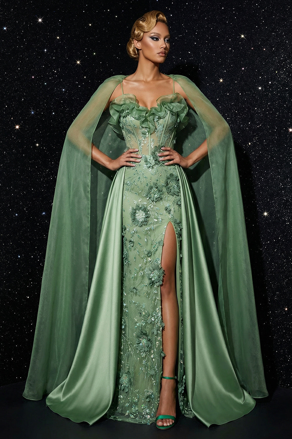 Green Mermaid Spaghetti Straps Embroidered Corset Ruffled Long Prom Dress with Slit