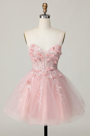 Pink Corset Tulle A Line Short Homecoming Dress with Appliques