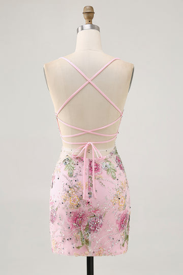 Pink Bodycon Short Floral Homecoming Dress with Sequins