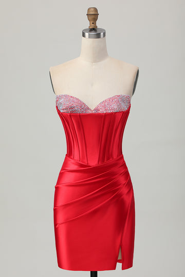 Red Bodycon Strapless Beaded Corset Homecoming Dress with Slit