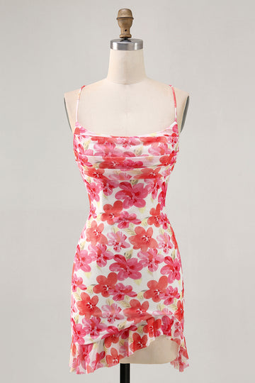 Red Flower Bodycon Spaghetti Straps Printed Mini Homecoming Dress