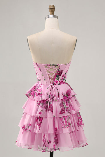 Pink Floral A Line Corset Strapless Tiered Homecoming Dress with Lace Up Back