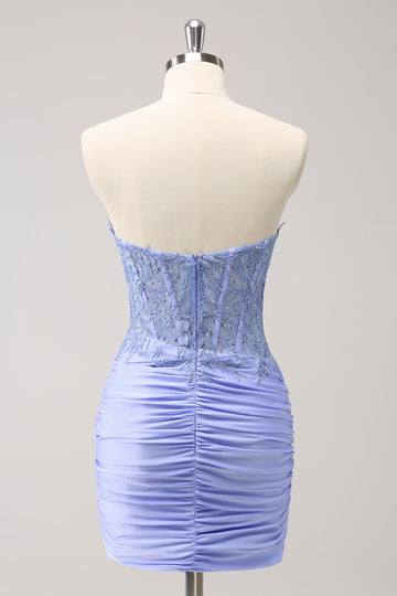 Lilac Strapless Corset Pleated Tight Homecoming Dress with Appliques