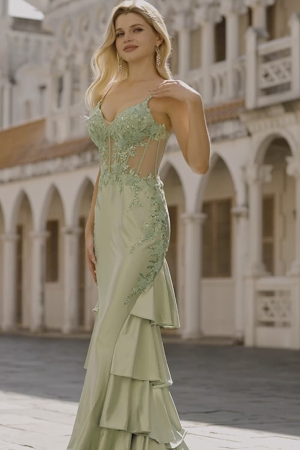 Sage Green Mermaid Ruffled Satin Corset Long Prom Dress with Appliques