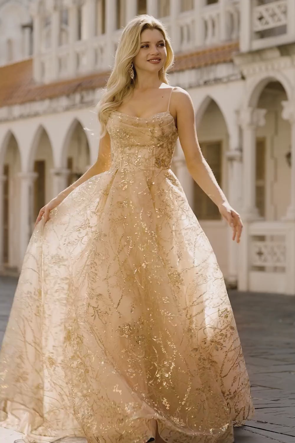 Sparkly Champagne A-Line Corset Long Tulle Prom Dress with Sequins