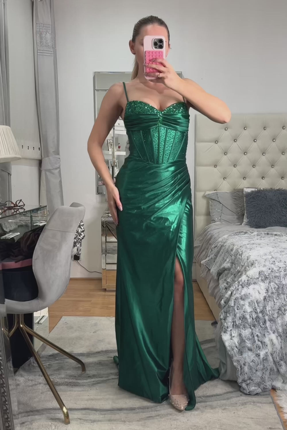Sparkly Dark Green Mermaid Corset Beaded Long Prom Dress with Slit