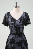 Black V-neck Short Sleeves Lace A-Line Mother of Bride Dress