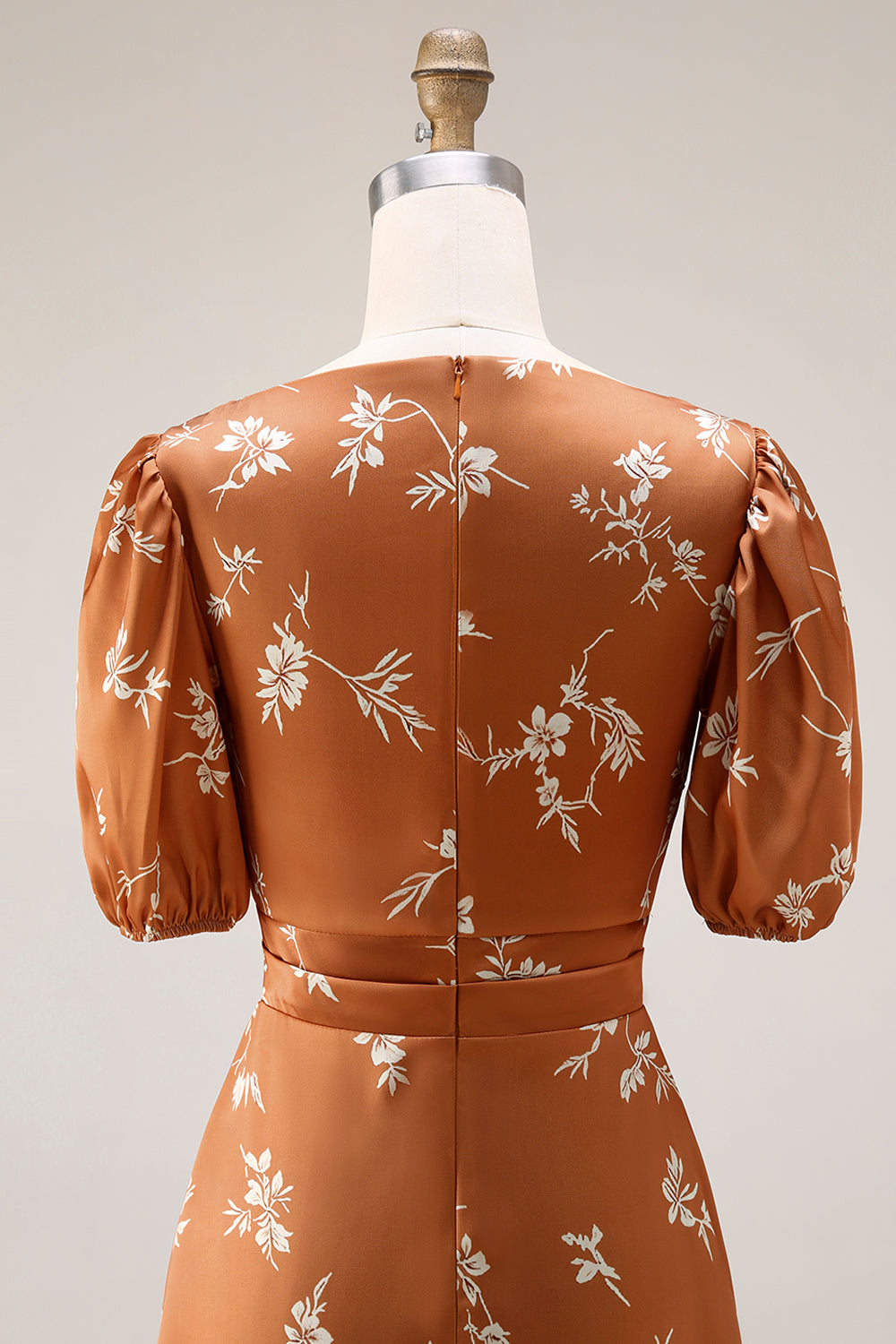 Orange Floral Printed A Line Midi Wedding Guest Dress with Sleeves
