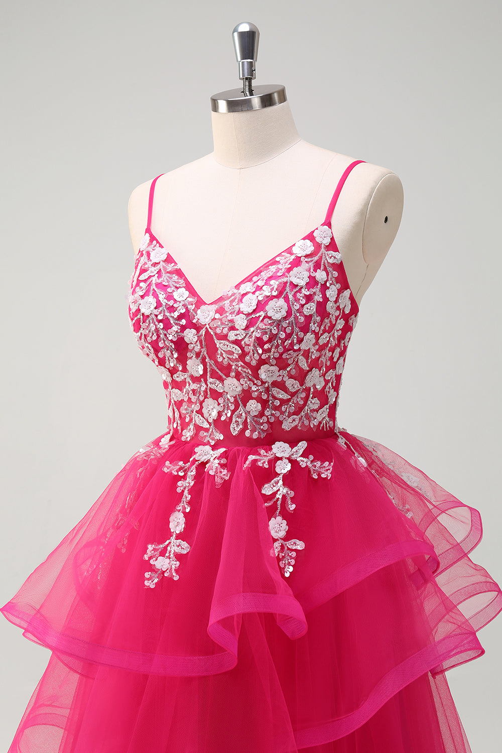 Sparkly Fuchsia A-Line Spaghetti Straps Ruffles Tulle Long Prom Dress with Appliques