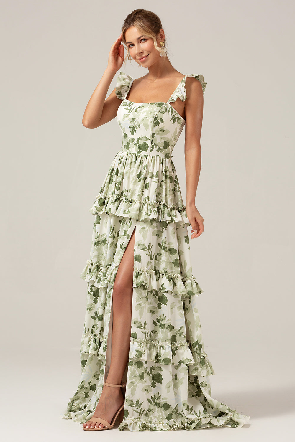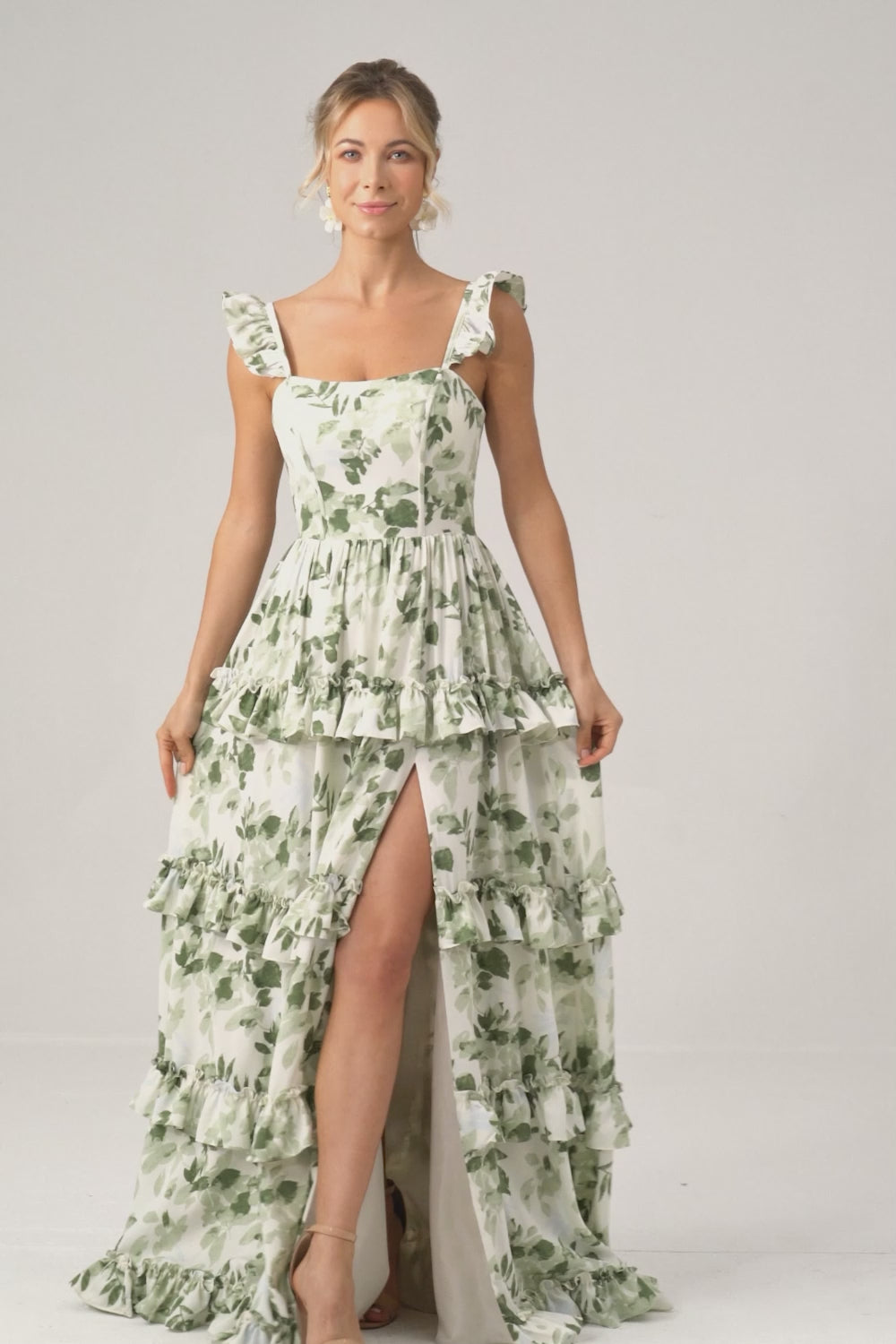 Green A Line Ruffles Tiered Lace Up Back Long Satin Floral Dress with Slit