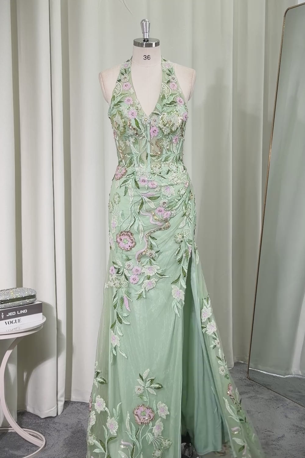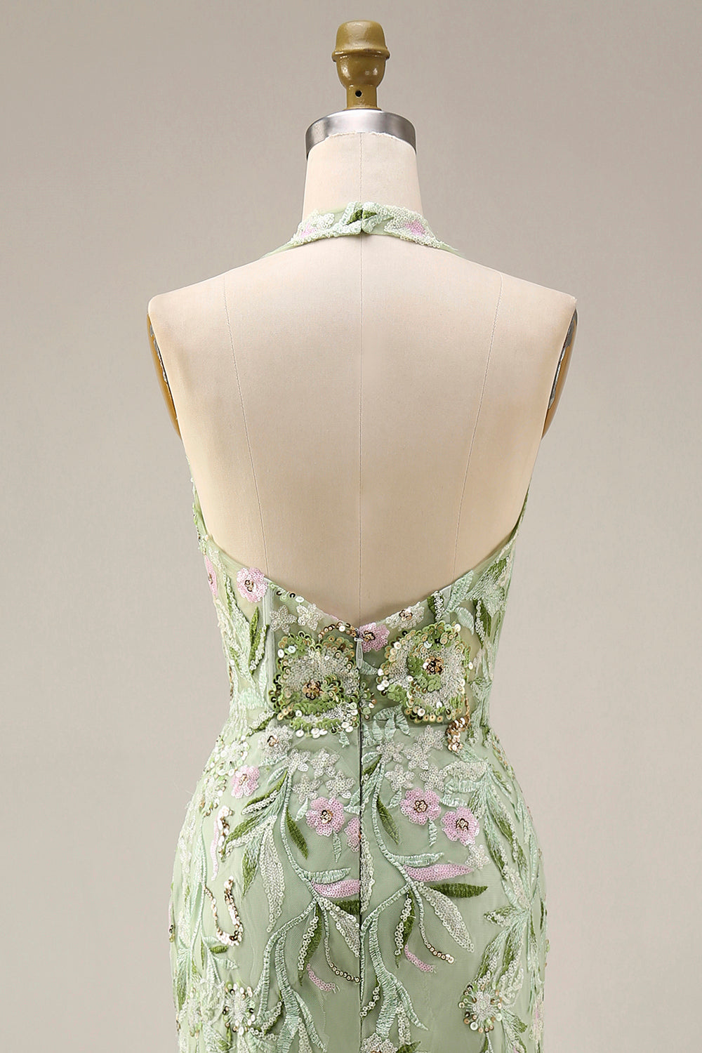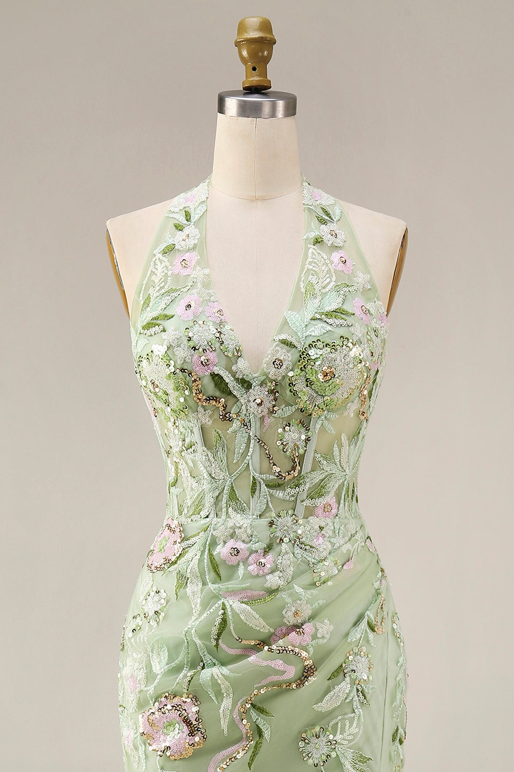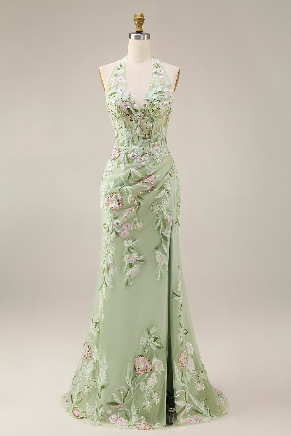 Dusty Sage Halter Sheer Corset Sheath Embroidered Long Prom Dress with Slit