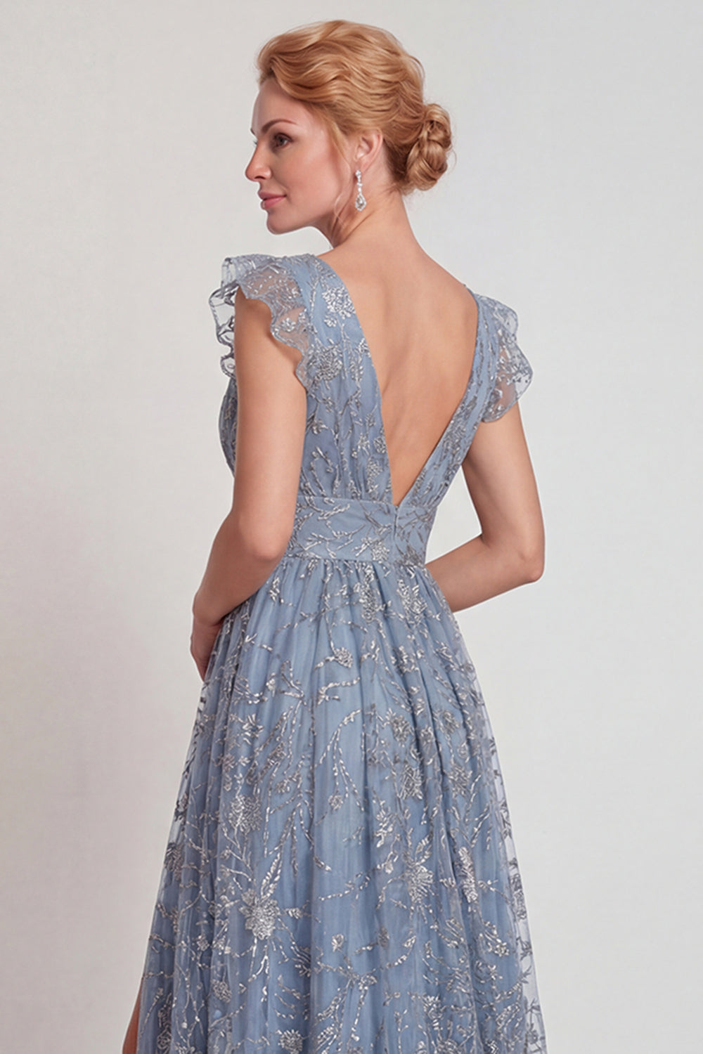 Grey Blue Appliqued V Neck A Line Mother of the Bride Dress with Slit