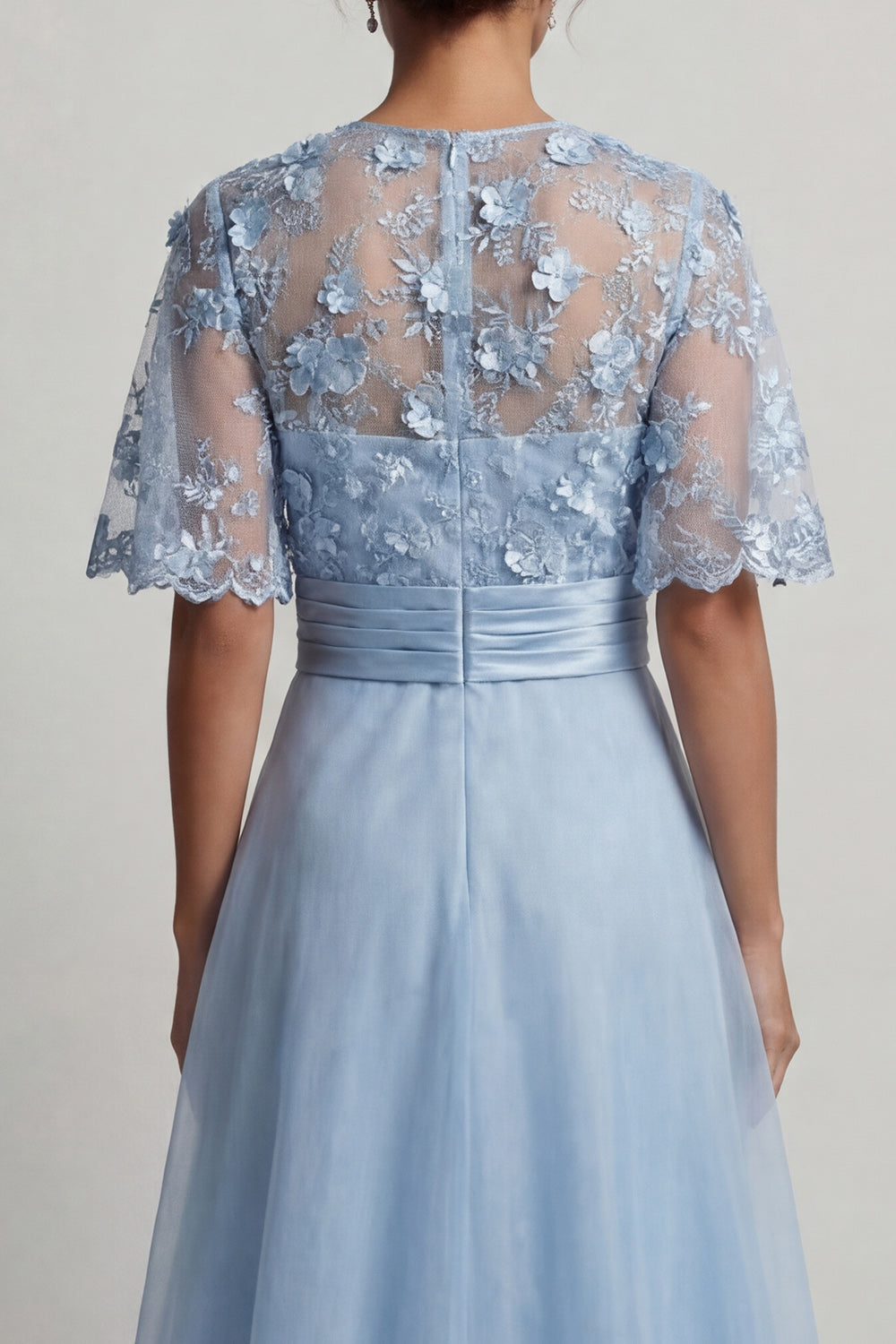 Sky Blue Chiffon A Line Half Sleeves Long Mother of the Bride Dress with 3D Flowers