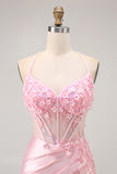 Candy Pink Bodycon Beaded Corset Short Homecoming Dress with Appliques