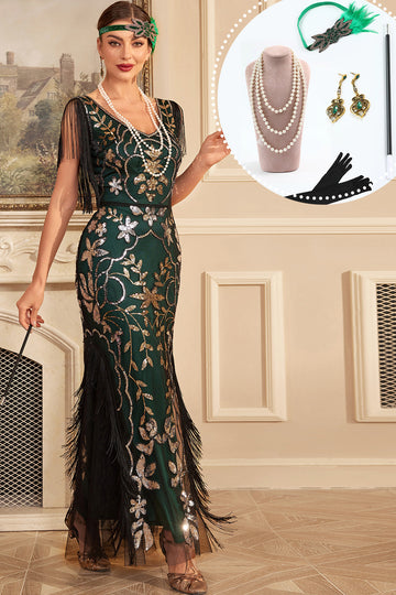 Green Golden Sequins Fringe Long 1920s Flapper Dress with Accessories Set