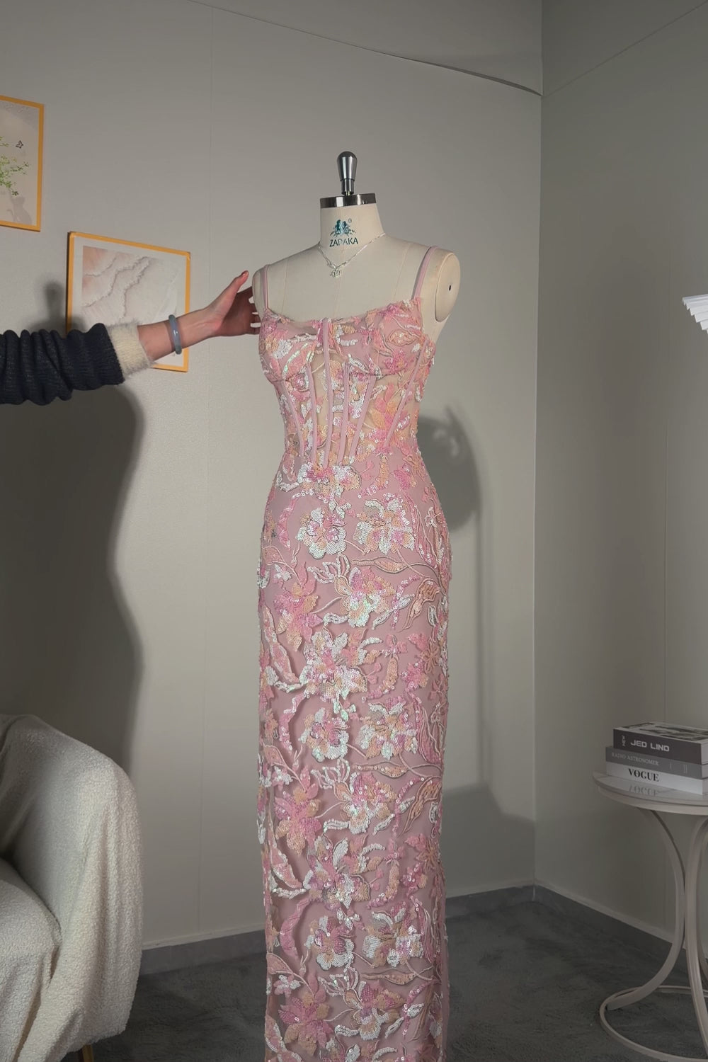 Sparkly Blush Pink Sheath Sheer Boned Corset Long Prom Dress with Sequins