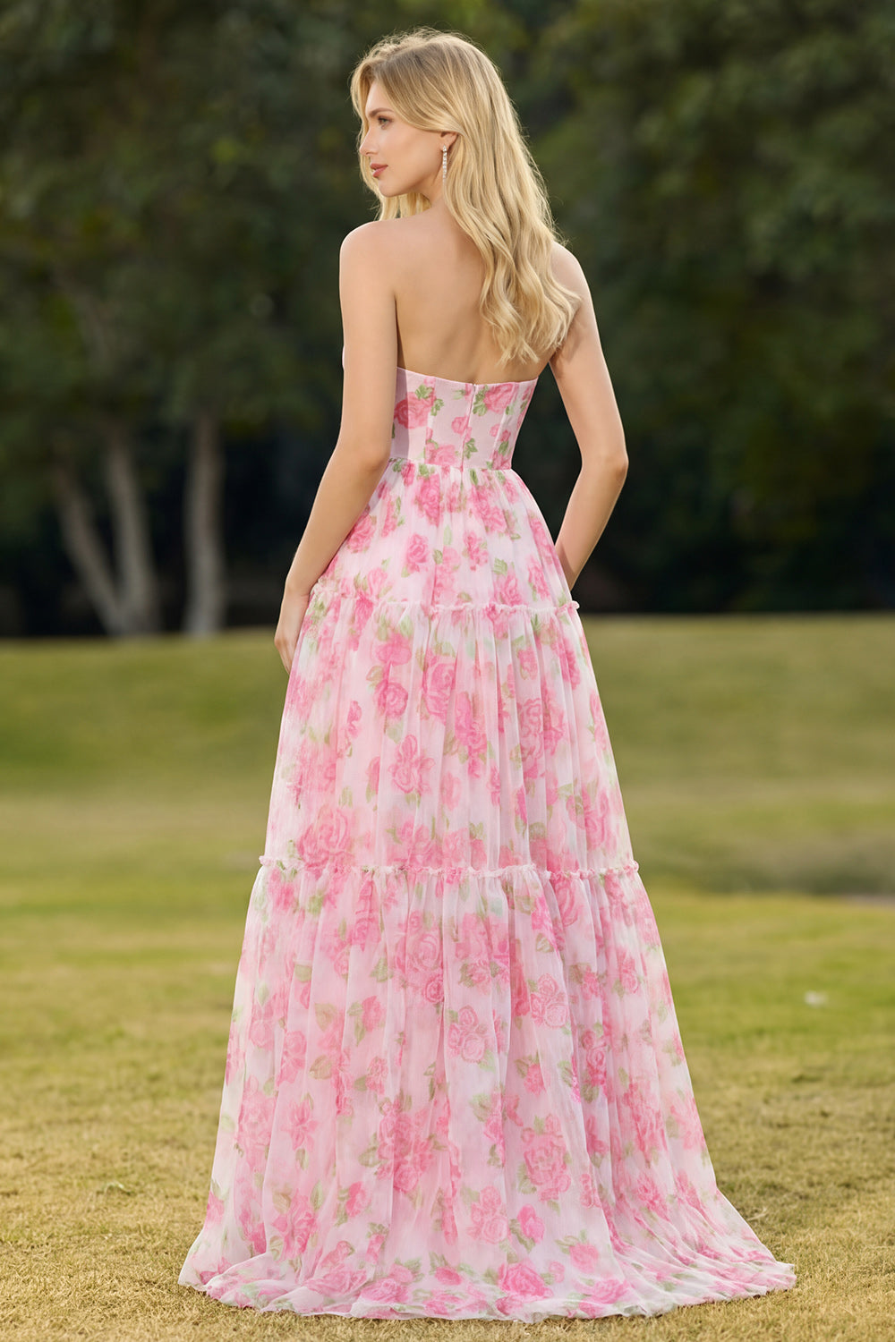 Pink Print Floral Strapless A Line Corset Long Prom Dress