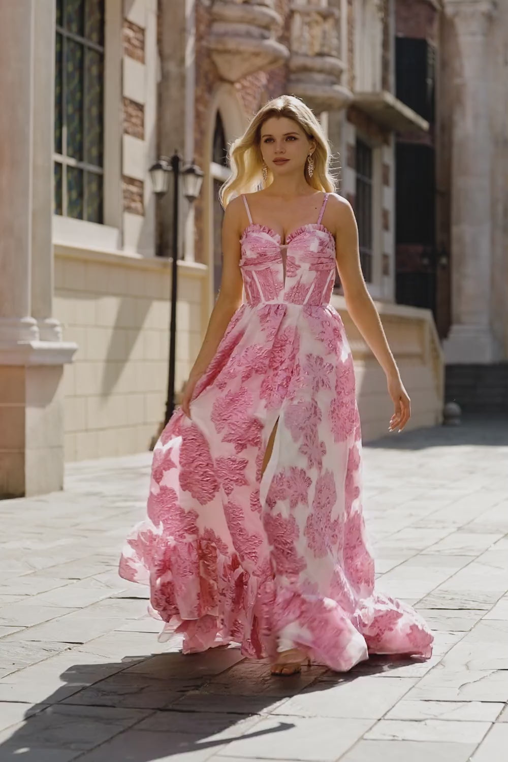 Strapless A Line Pink Jacquard Corset Long Prom Dress with Slit