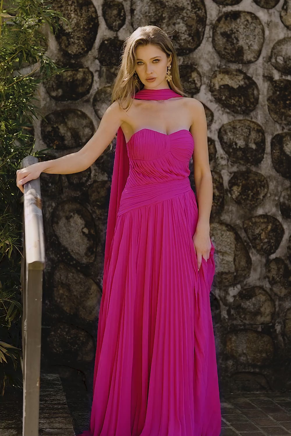 Fuchsia A Line Strapless Pleated Tulle Long Prom Dress with Streamer