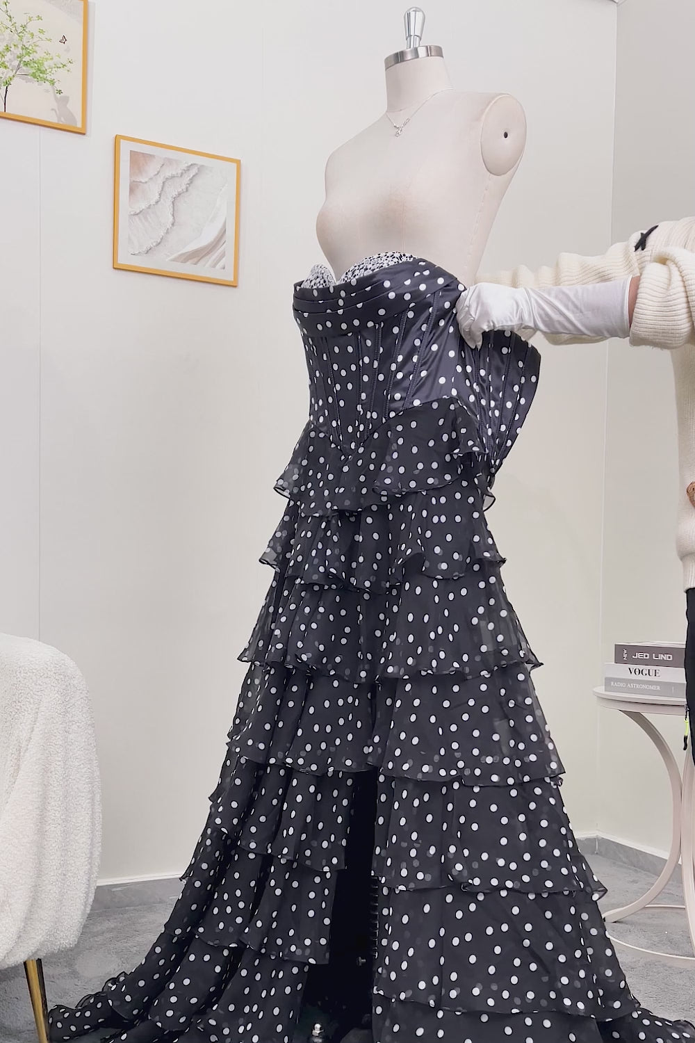 Black and White A Line Strapless Corset Tiered Long Polka Dots Prom Dress with Ruffles