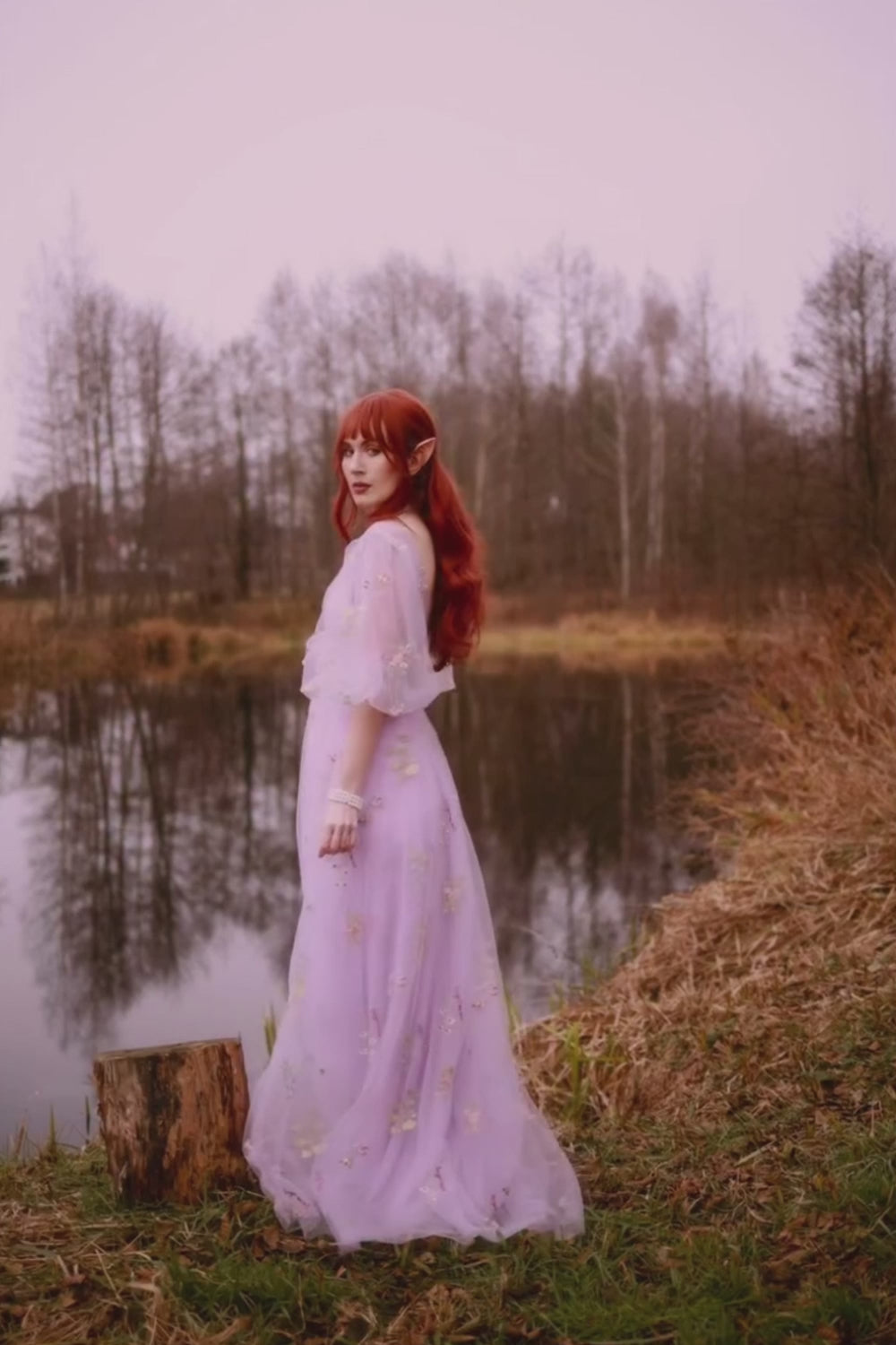 A-Line V-Neck Embroidery Lavender Long Prom Dress with Short Sleeves