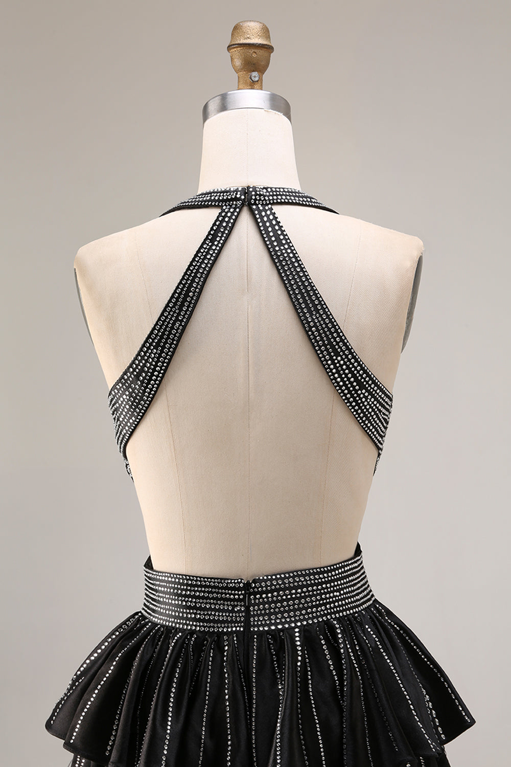 Black Tiered Ruffle A Line Halter Beaded Open Back Long Prom Dress with Slit