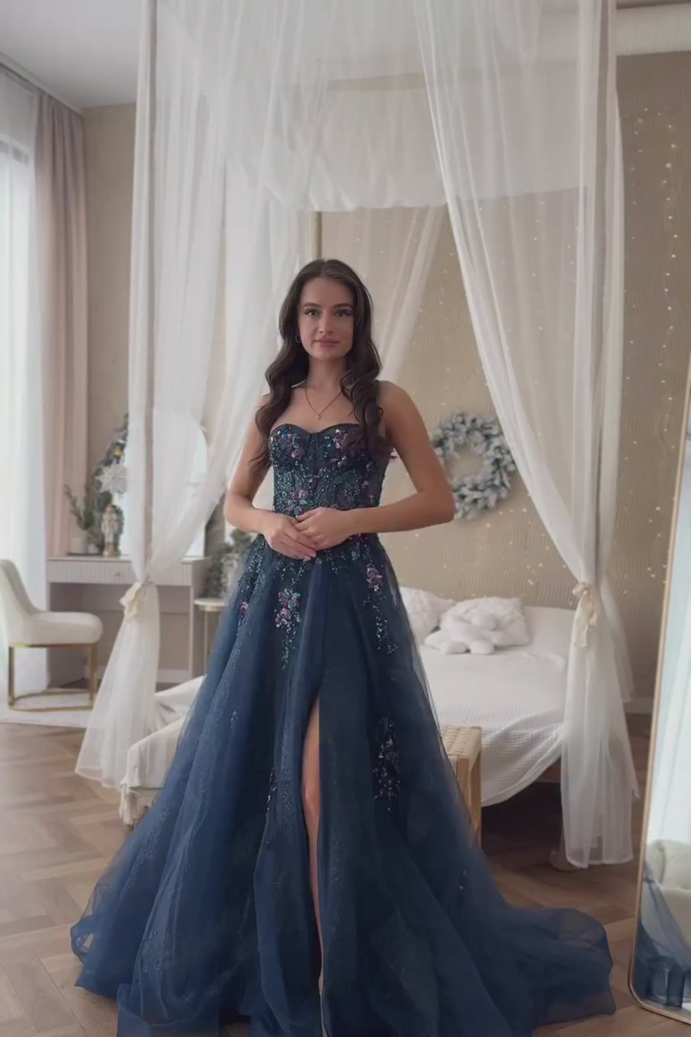 Navy A Line Strapless Sequins Tulle Corset Long Prom Dress With Slit
