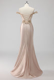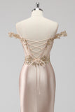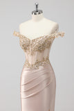 Sparkly Champagne Off the Shoulder Corset Appliqued Prom Dress with Slit