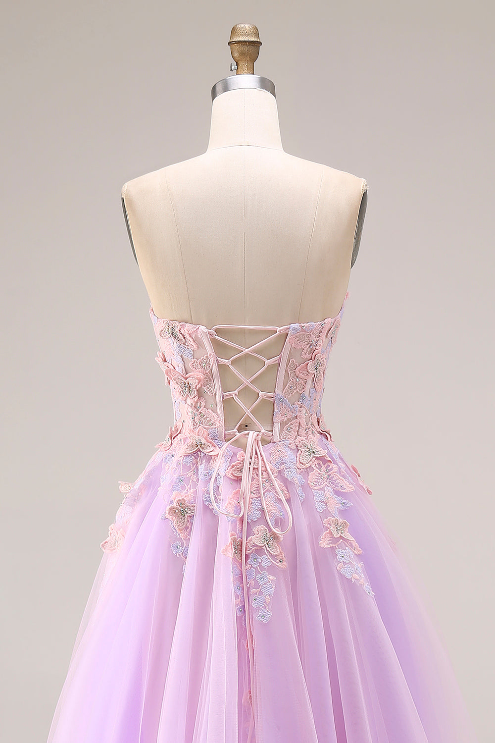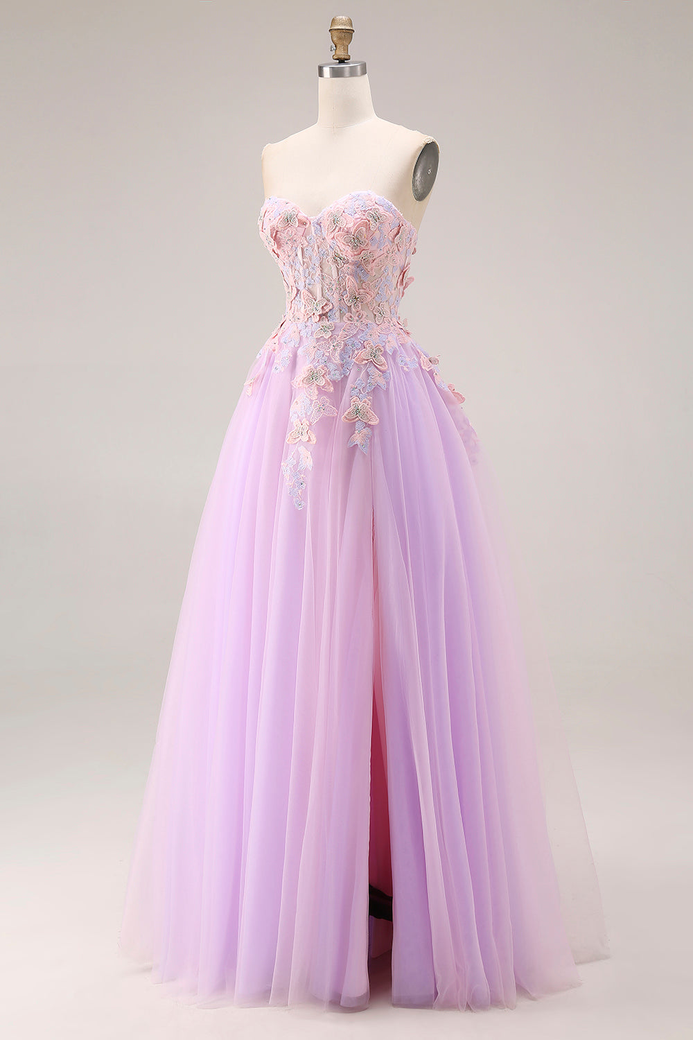 Sweetheart Lilac Tulle A-Line Appliqued Long Prom Dress with Slit