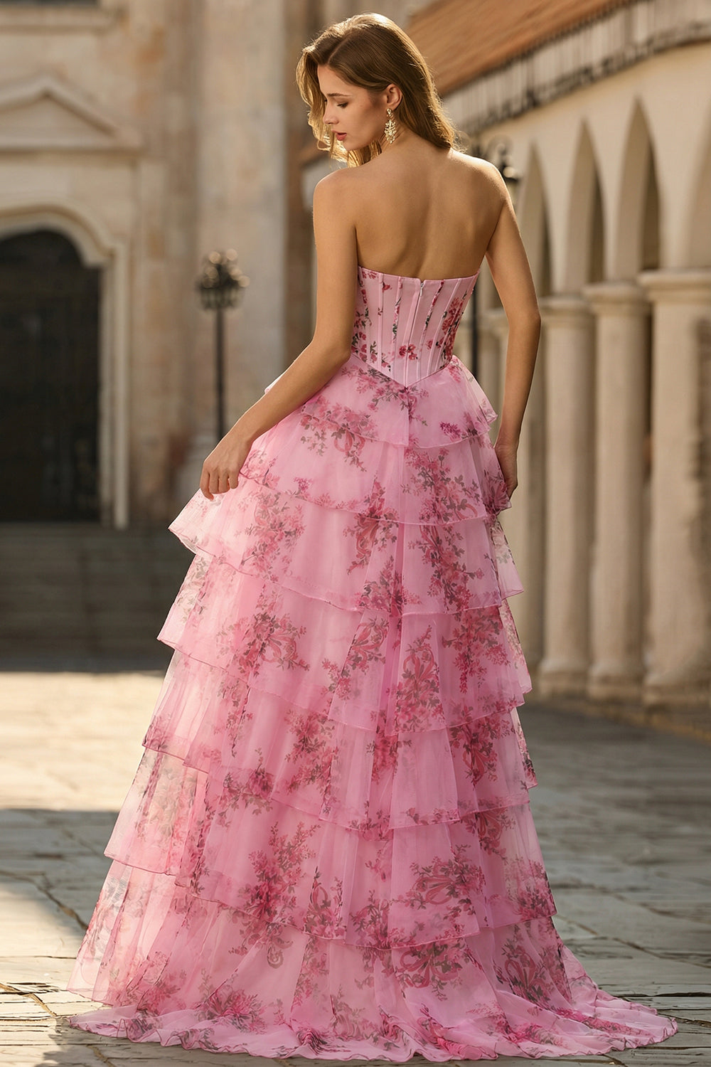 White Blue Flower A-Line Basque Waist Strapless Tiered Long Prom Dress with Slit