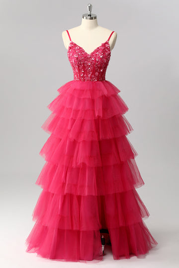 Fuchsia Corset A Line Spaghetti Straps Beaded Tiered Prom Dress with Slit