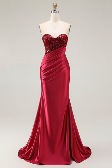 Strapless Beaded Mermaid Red Long Prom Dress with Slit
