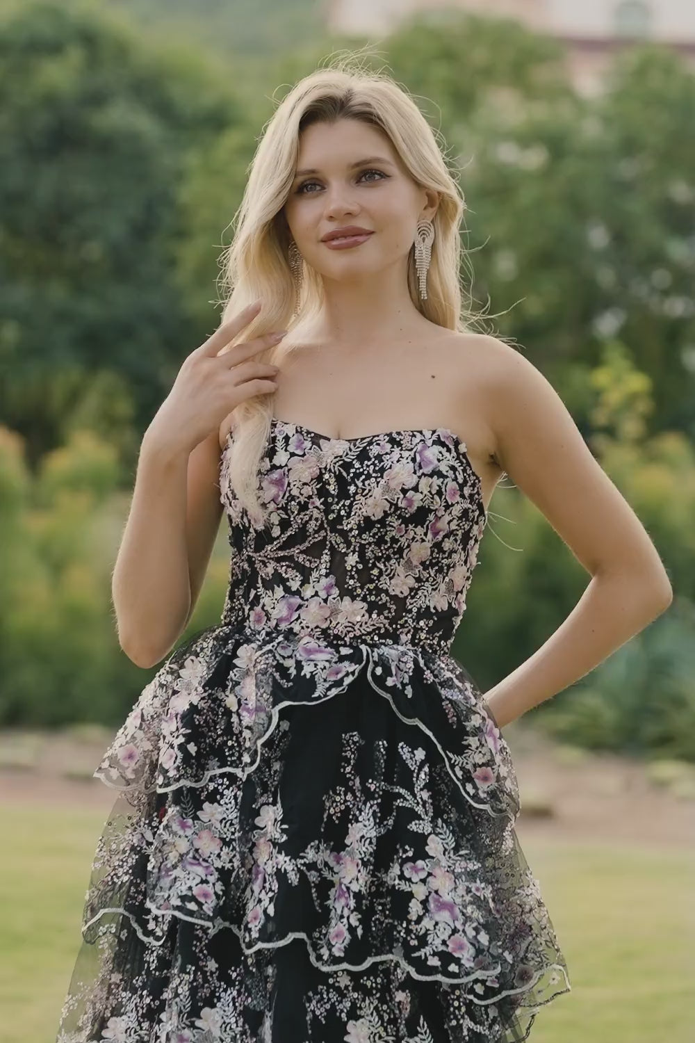 Black Pink Flower Strapless Tiered A-Line Sequin Long Prom Dress with Lace Up Back