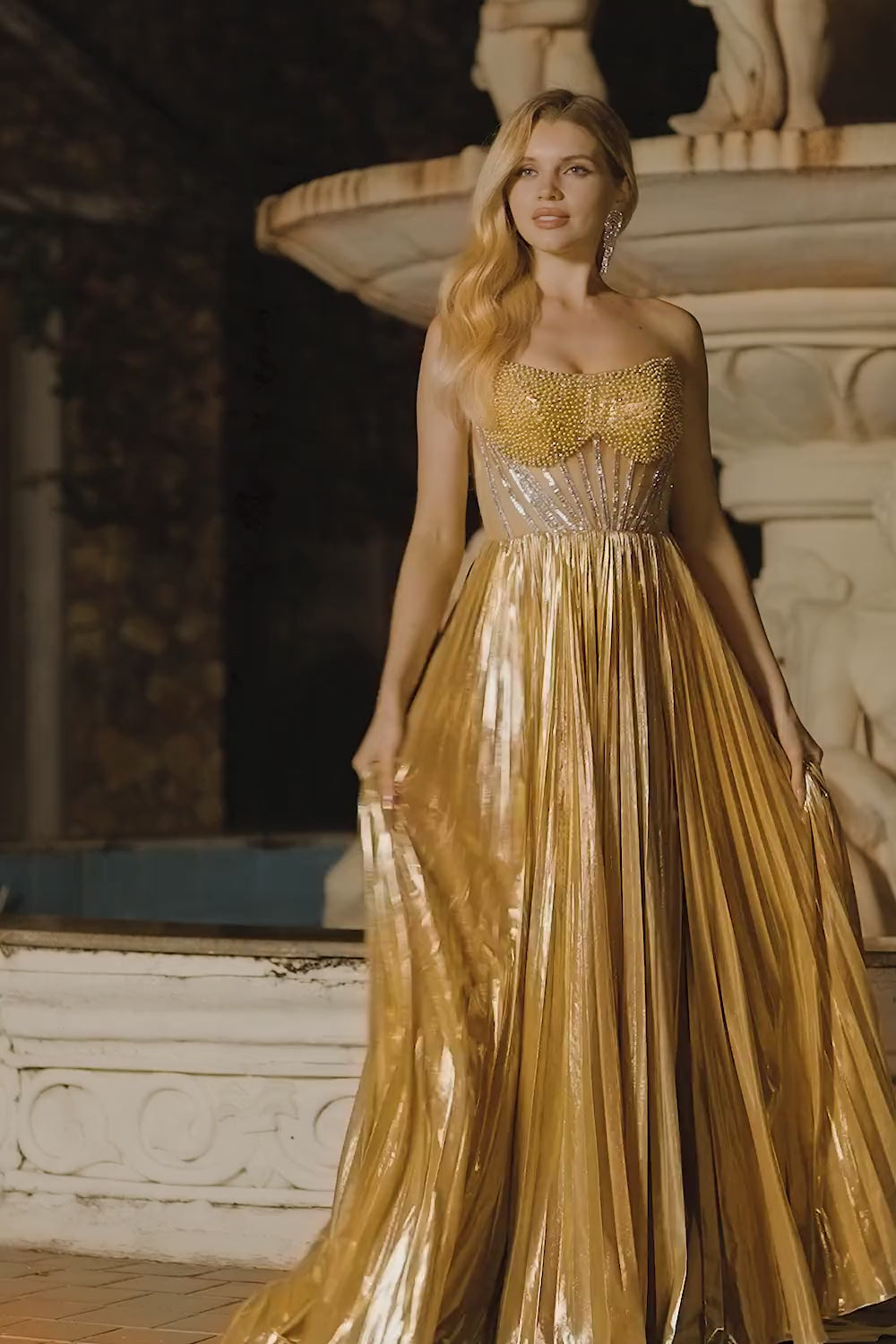 Metallic Golden Strapless Pleated A-Line Corset Beaded Long Prom Dress with Slit