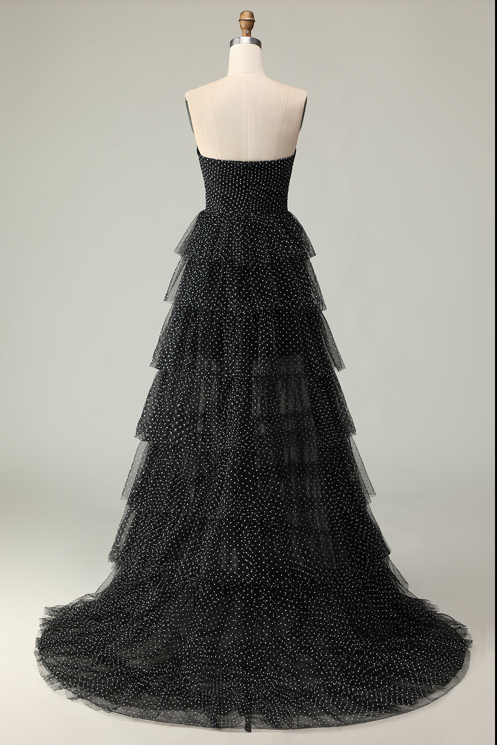 Black A Line Strapless Tiered Ruffle Polka Dots Long Prom Dress with Slit